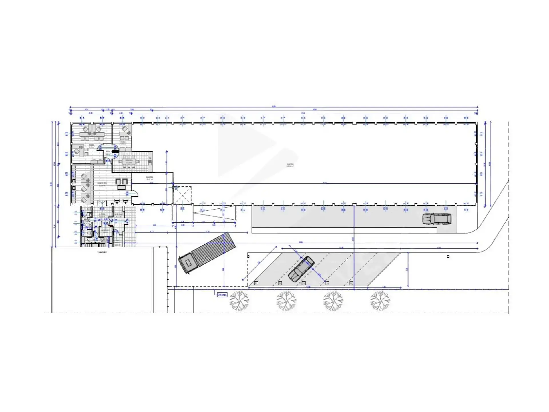 - Helységlista: raktár (584,84 m2), raktár (29,31 m2), iroda (11,75 m2), iroda (32,13 m2), közlekedő (3,53 m2), konyha (17,70 m2), ügyféltér (50,06 m2), előtér (10,35 m2), szélfogó (6,77 m2), vill. kapcsoló (2,38 m2), gépészet (2,80 m2), öltözők (6,90 m2), mosdó + WC (6,75 m2);