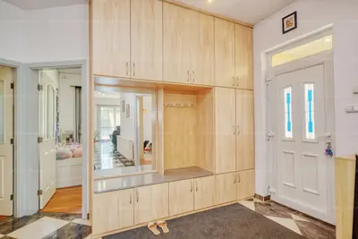 A vételárrészét képezi a beépített gépesített konyhabútor, a beépített előszoba szekrény és minden beépített szekrény, a klíma, és a dupla garázs is.