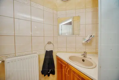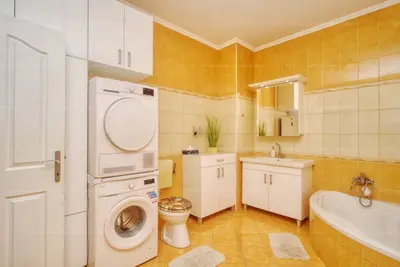 A hatalmas fürdőszobába kényelmesen még egy mosókonyha is elfér, az illemhely külön helyiségben található, sőt még háztartási helyiség is rendelkezésre áll.