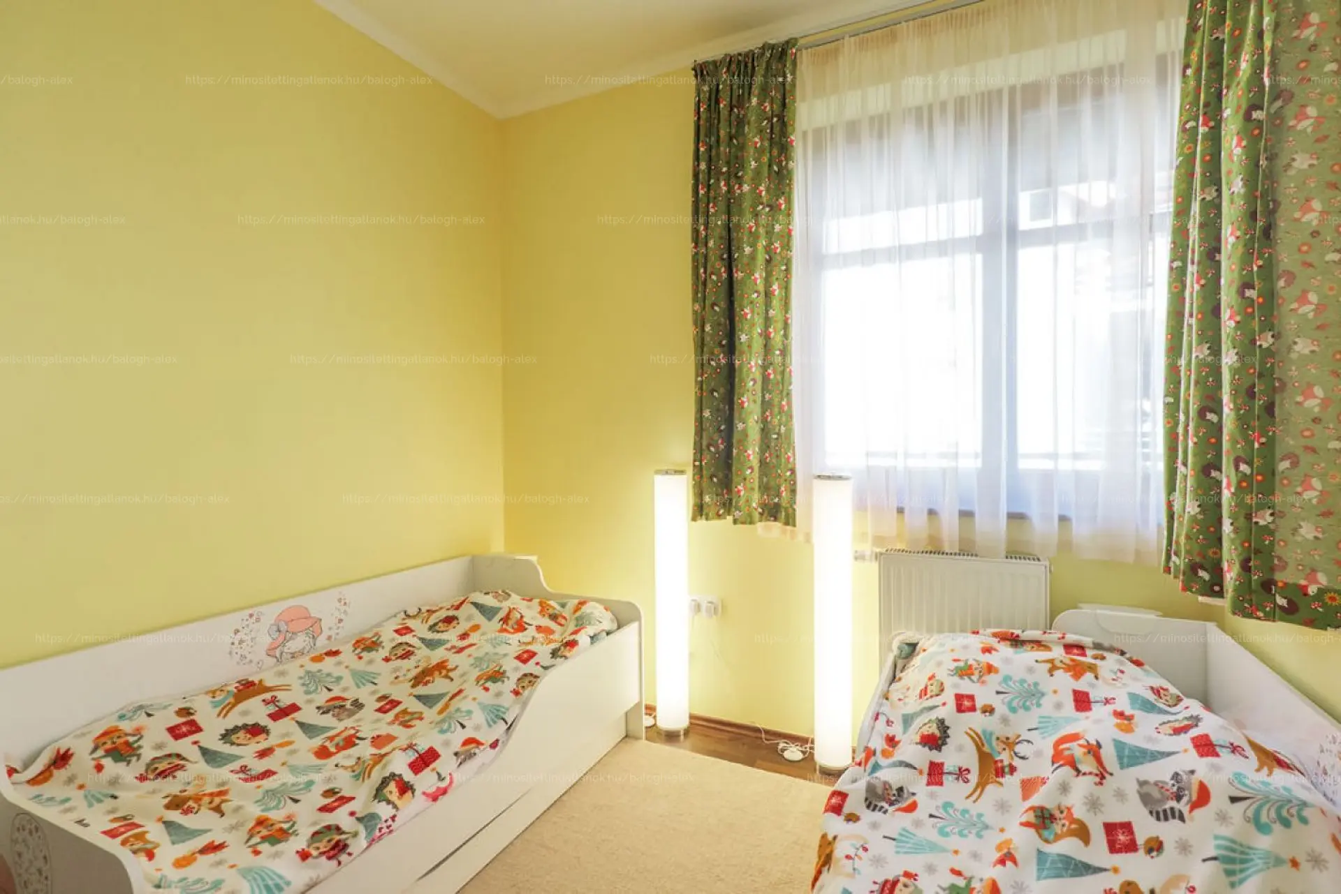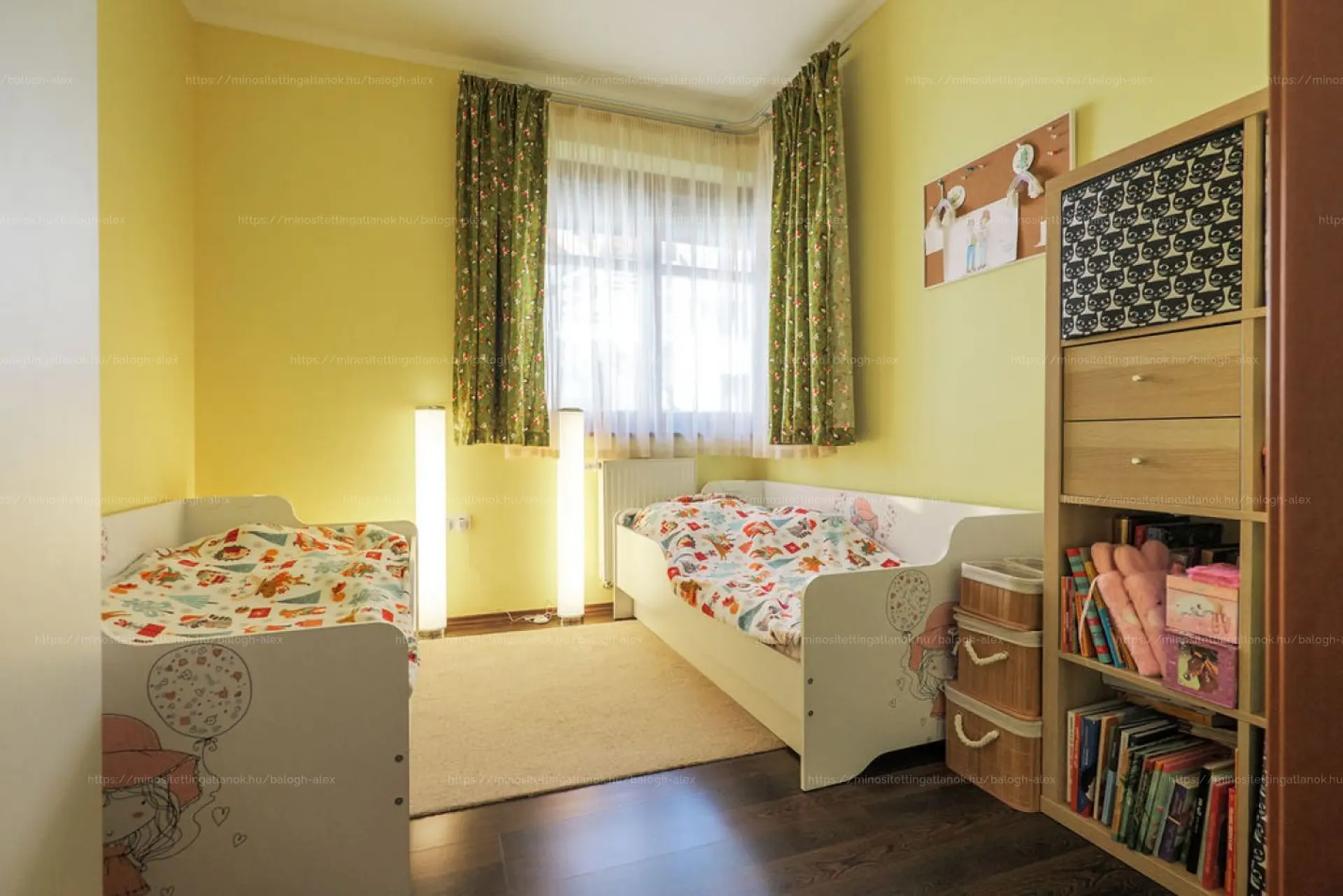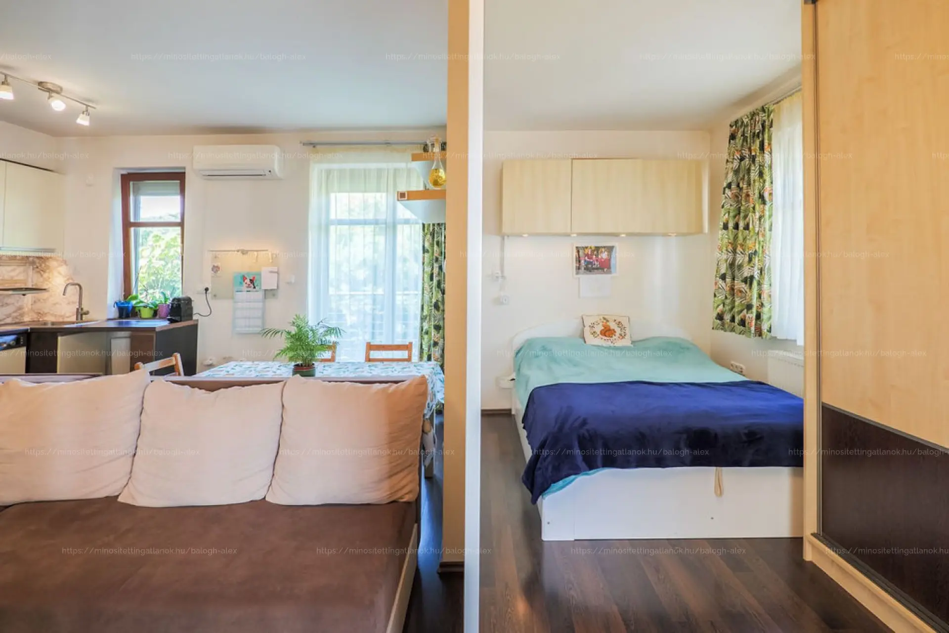 A 21 m²-es amerikai konyhás nappali mellett két hálószobát találunk, így ideális választás lehet gyermekes családnak vagy dolgozószobát keresőknek is. A nappali és a hálószoba között egy válaszfal, és egy térelválasztós tolóajtó (videóban bemutatva) került kialakításra, illetve a bejárati ajtóval szemben pedig egy 8 m²-es, jelenleg gyerekszobát találunk.
