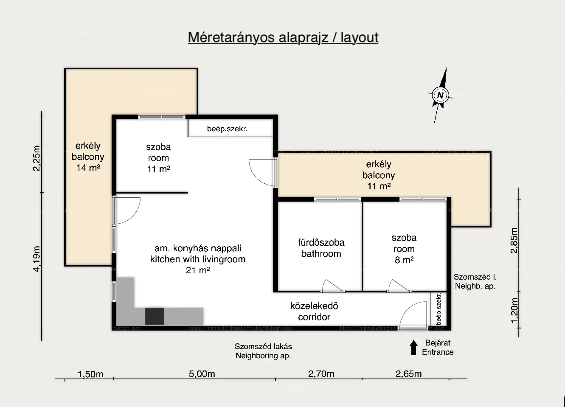 A 70 m²-es lakás minden részletében jól átgondolt és megtervezett. Az ingatlan nettó hasznos alapterülete 58 m², amelyhez kapcsolódik kettő erkély, összesen 25 m²-es alapterülettel. A hirdetésben feltöltésre került egy méretarányos alaprajz.