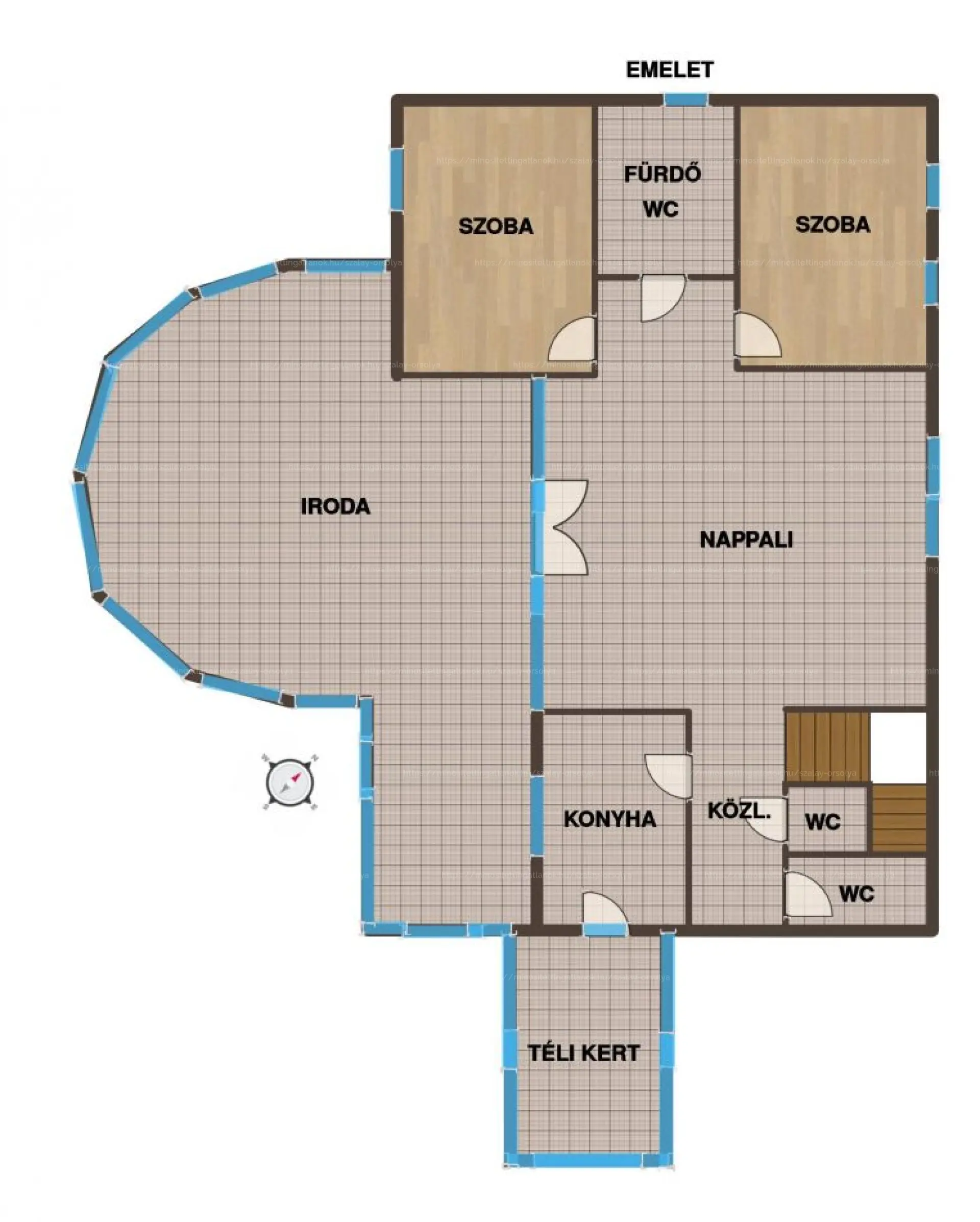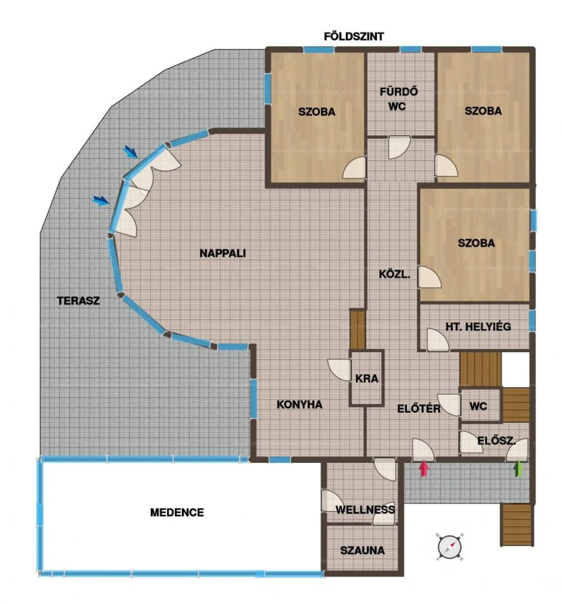 Lakrész és irodaként: földszinten amerikai konyhás nappali teraszkapcsolattal és medencével, wellness rész szaunával, három hálószoba, fürdő WC-vel és külön WC, felső szinten pedig iroda. A legalsó szinten garázs, tárolók, konditerem.