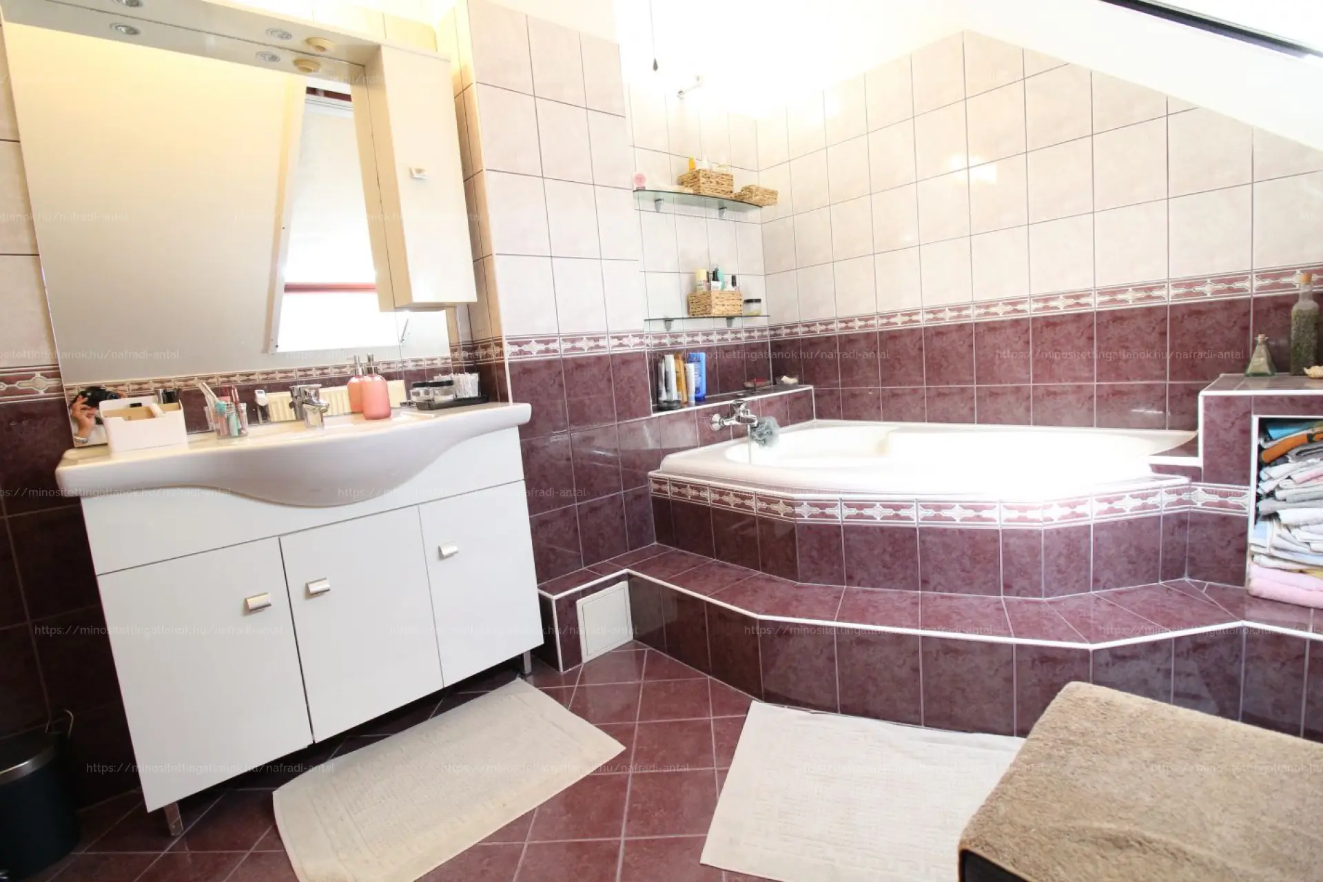 A felső 75 m2-es szinten 3 hálószoba, közlekedő, kádas fürdőszoba és külön WC kapott helyet.