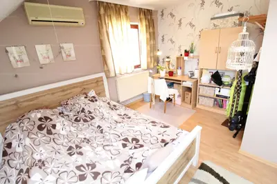 A felső 75 m2-es szinten 3 hálószoba, közlekedő, kádas fürdőszoba és külön WC kapott helyet.