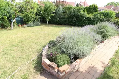 Pihenés céljára az udvaron igényes kerti kiülő és egy sütögetőhely is ki van alakítva. A 601 m2-es telek nagyrésze szépen gondozott fűvel, virágokkal borított, a kicsibejáró és kiülő környéke térkővel és betonnal burkolt.