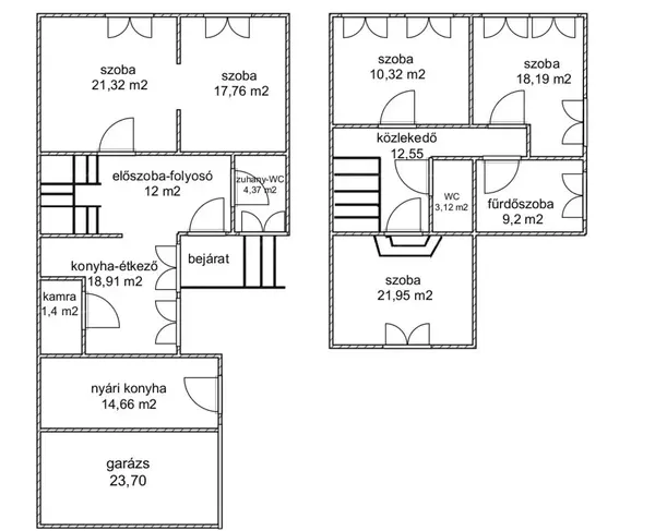 Az alsó szint 91 m2-es, ahol tágas nappali, 1 szoba, étkezős konyha, kamra, előszoba-folyosó és zuhanyzós fürdőszoba található. Az egybeépített udvari szárnyban nyári konyha és egy 23,7 m2-es garázs lett kialakítva. Az kisebbik alsó szoba könnyedén visszaalakítható az eredeti, előszoba felőli bejáratúra, ezzel külön bejáratúvá téve a 2 szobát.