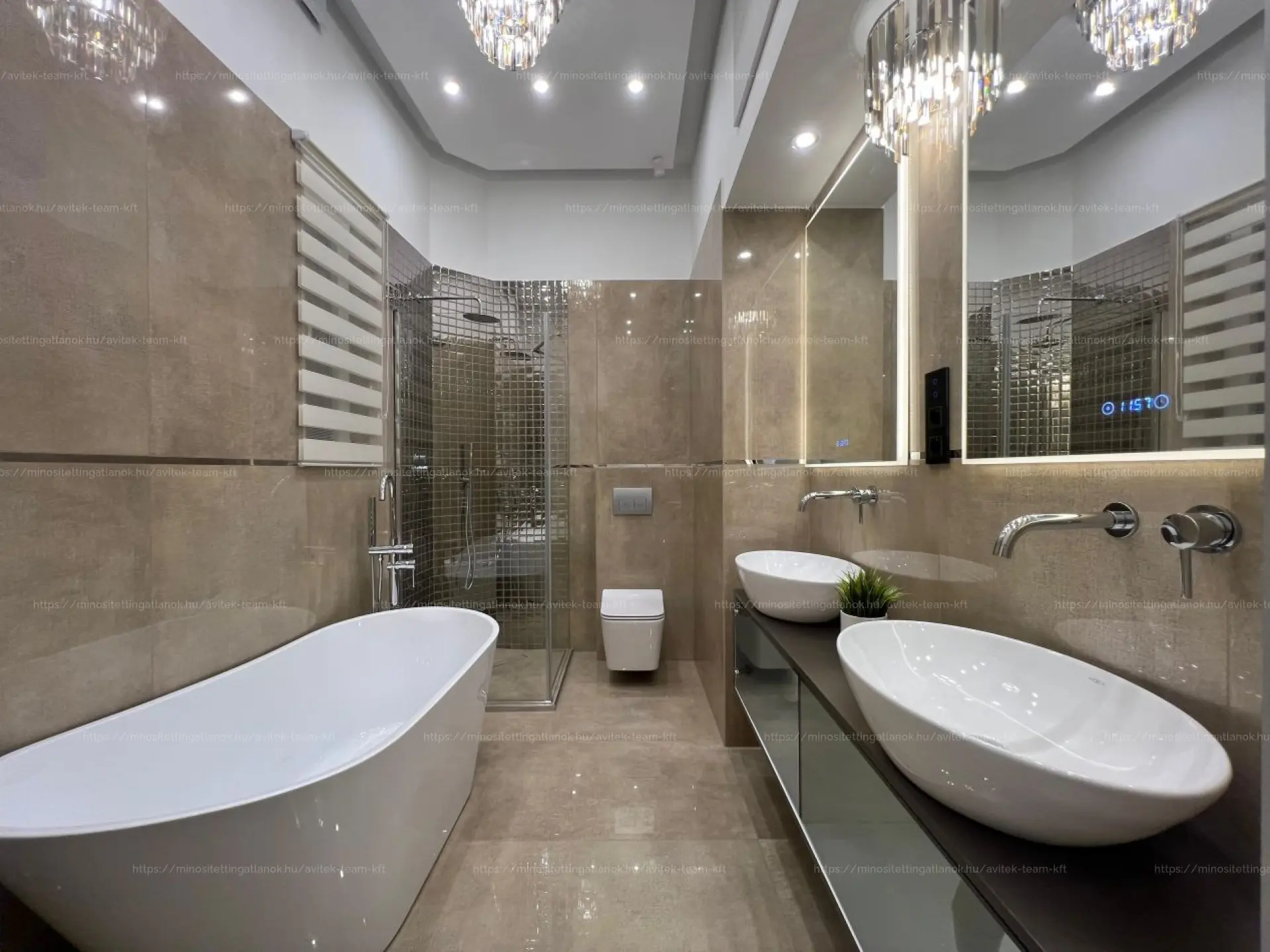 Az exkluzív fürdőszobában kád és zuhany, okostükör, dupla mosdó és wc található. lichthofra szellőzik és elszívó is beépítésre került.