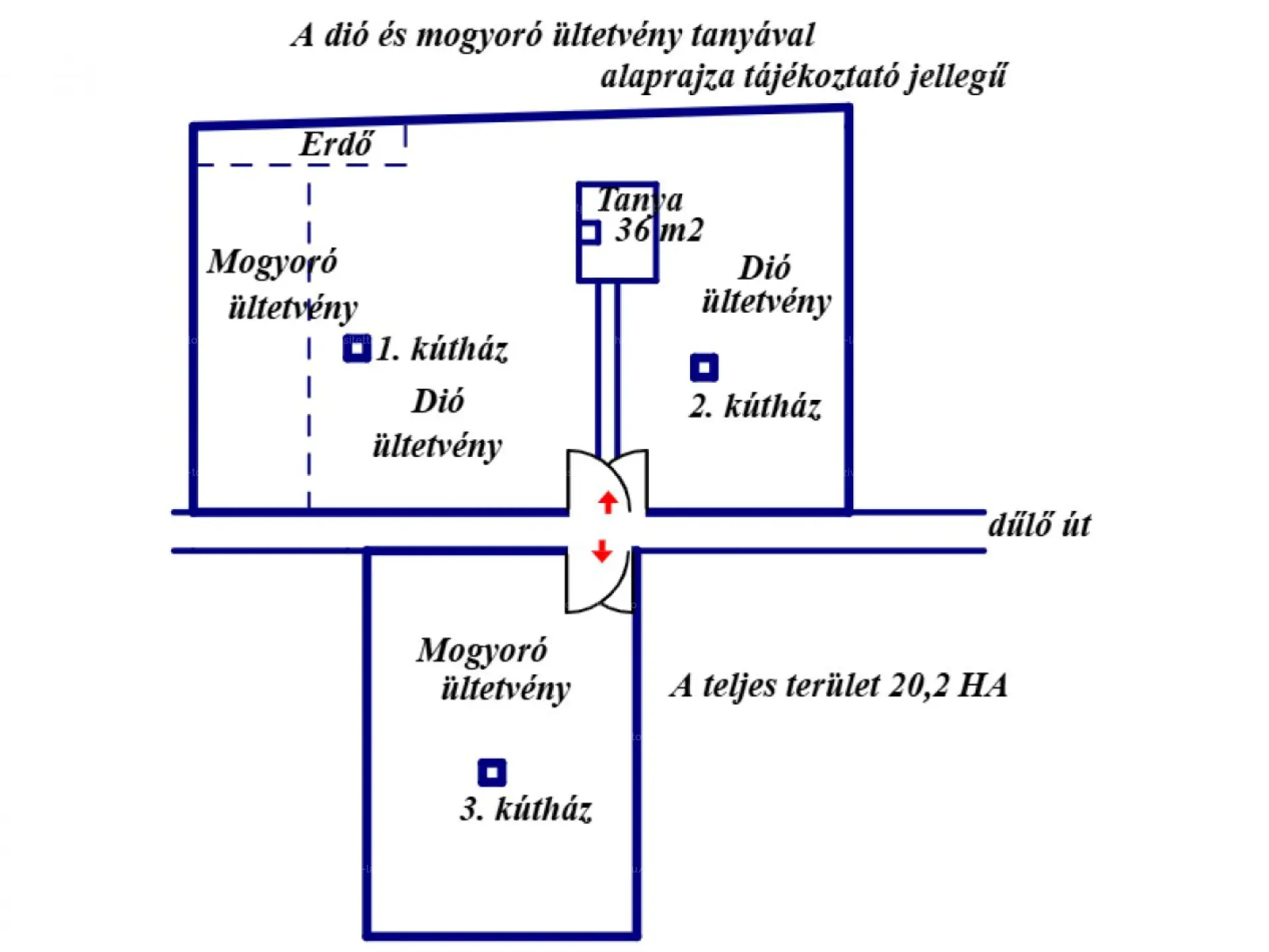 Az ültetvény (13 Ha) 2060 tő dióból, (6 Ha) 3750 tő mogyoróból, 6271 m2 legelő és erdőből, összesen 2369 m2 kivett felújítandó tanyából és saját használatú útból, három öntöző kútházból áll. A gazdaság kettő különálló területre osztott, mindkét rész körben bekerített. Gépjárművek behajtása kapubejárókon keresztül megoldott.