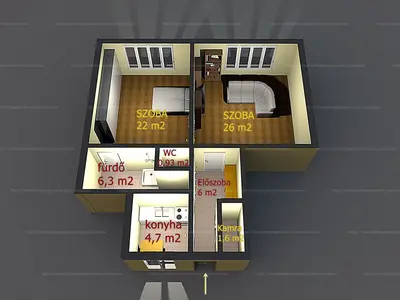 A lakás helyiségei: szoba 26 m2, szoba 22 m2, fürdő 6,3 m2, konyha 4,7 m2, külön WC 0,92 m2, előszoba 6 m2, kamra vagy tároló 1,6 m2.