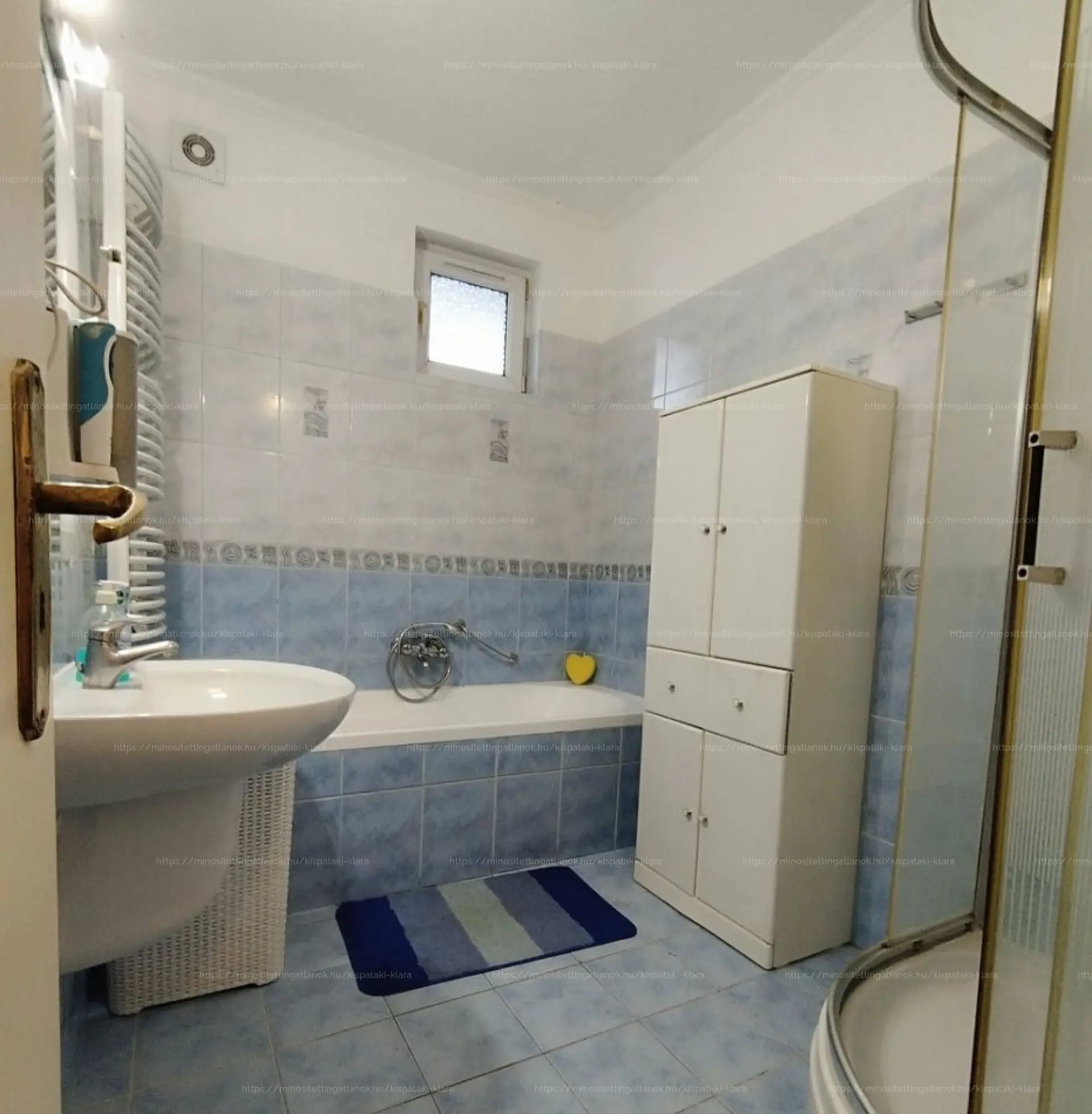 A fürdőszobában kád és tusolókabin is szolgálja a lakók kényelmét . A WC külön helyiségben található és mérete lehetővé teszi a mosógép elhelyezését is.