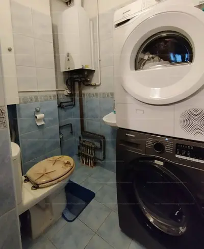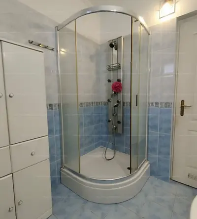 A fürdőszobában kád és tusolókabin is szolgálja a lakók kényelmét . A WC külön helyiségben található és mérete lehetővé teszi a mosógép elhelyezését is.