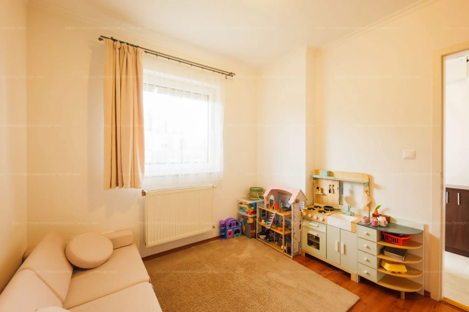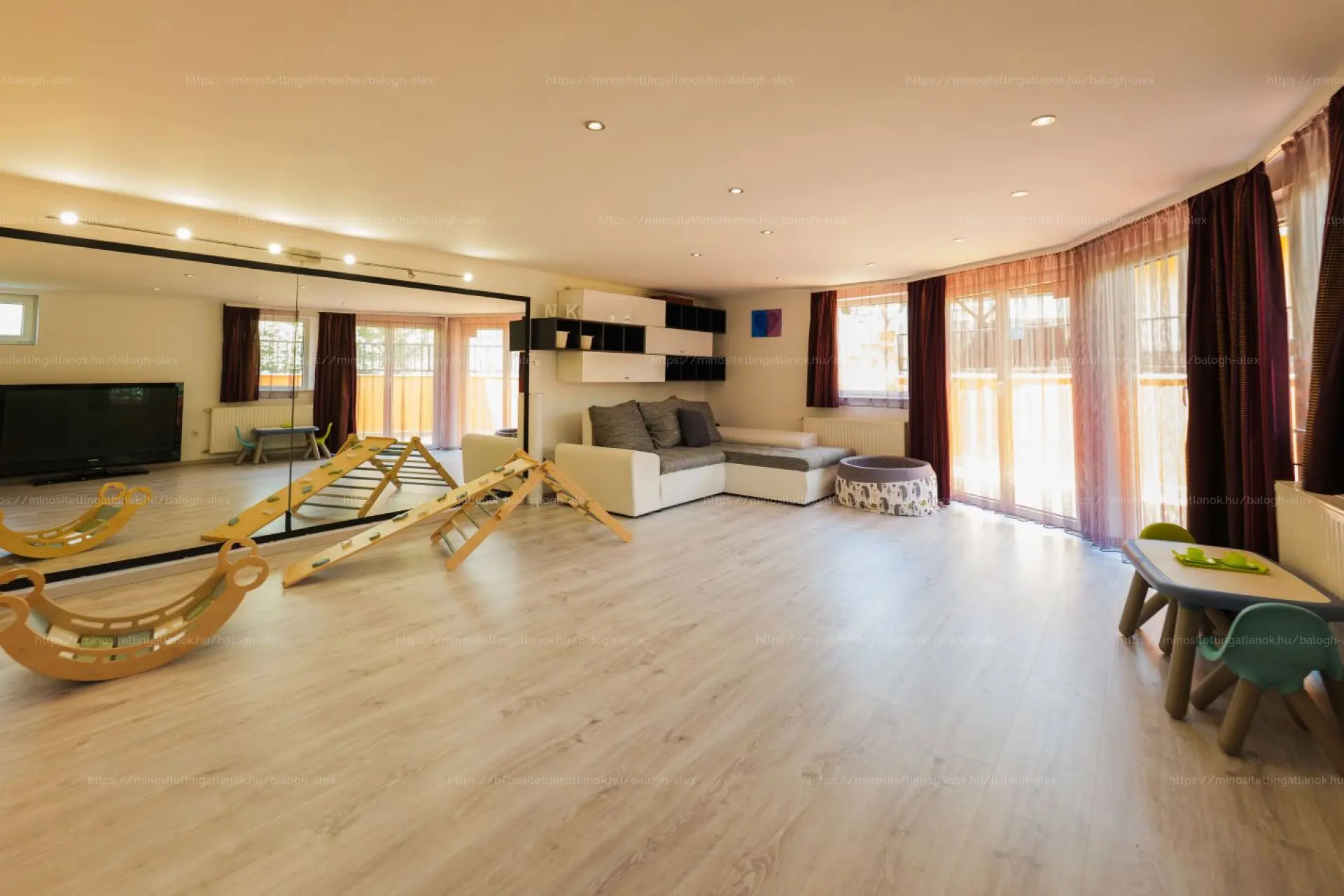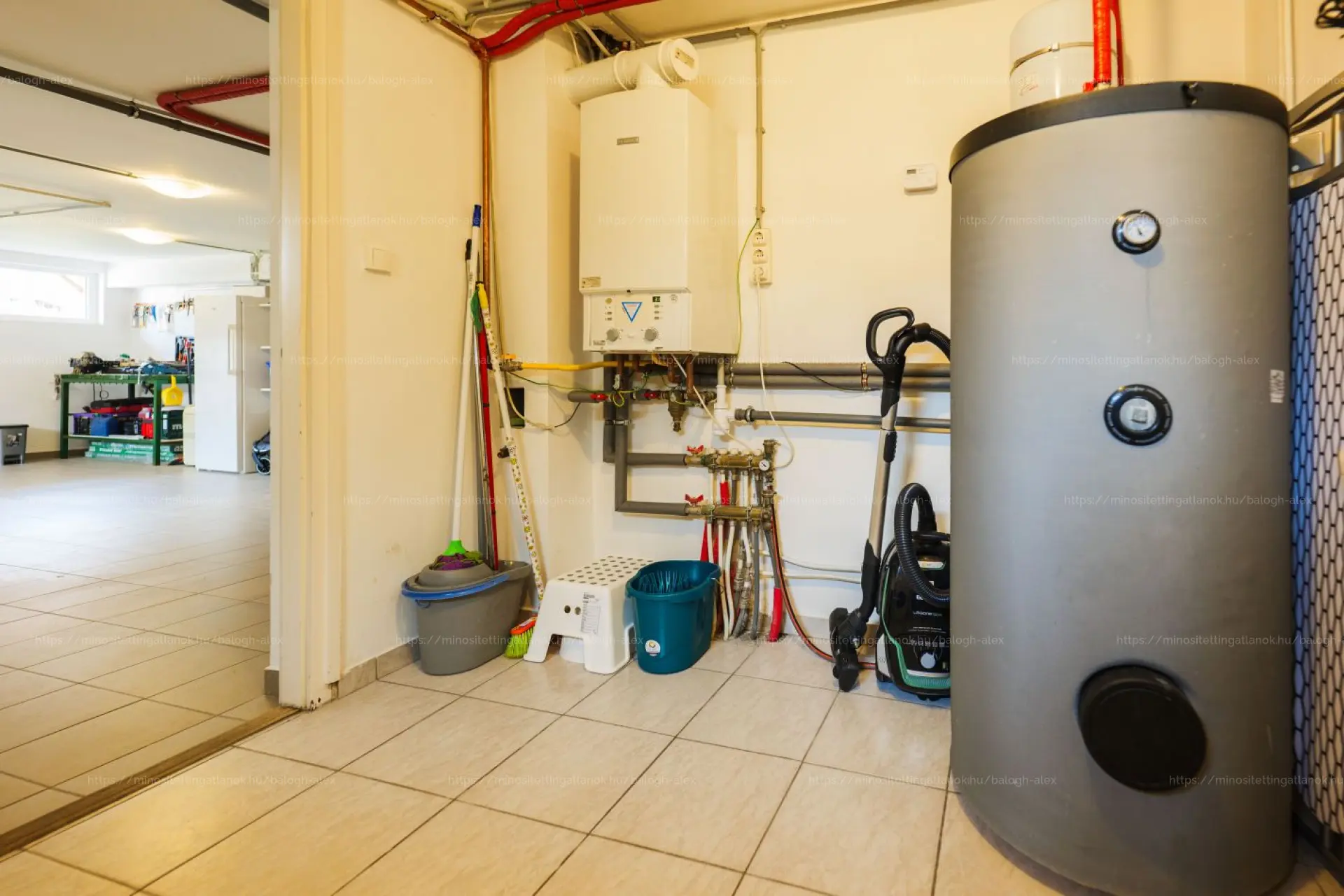 A 99 m²-es alsó szint ennél is több lehetőséget rejt: itt található a nagy méretű, többfunkciós „dühöngő” (jelenleg játszószoba, de lehet dolgozó, hobbiszoba vagy edzőterem is), valamint a kamra, a gépészeti helyiség és az alsó fürdőszoba. Ezek a helyiségek félszuterén jellegűek, szárazak, nem áznak, nem vizesednek, így hosszú távon is gondtalanul használhatók. Az alsó szinten található továbbá a nagyméretű garázs is, amely jelenleg egy nagy SUV-nek ad kényelmes helyet, de akár két közepes méretű autó is gond nélkül elfér egymás mellett.