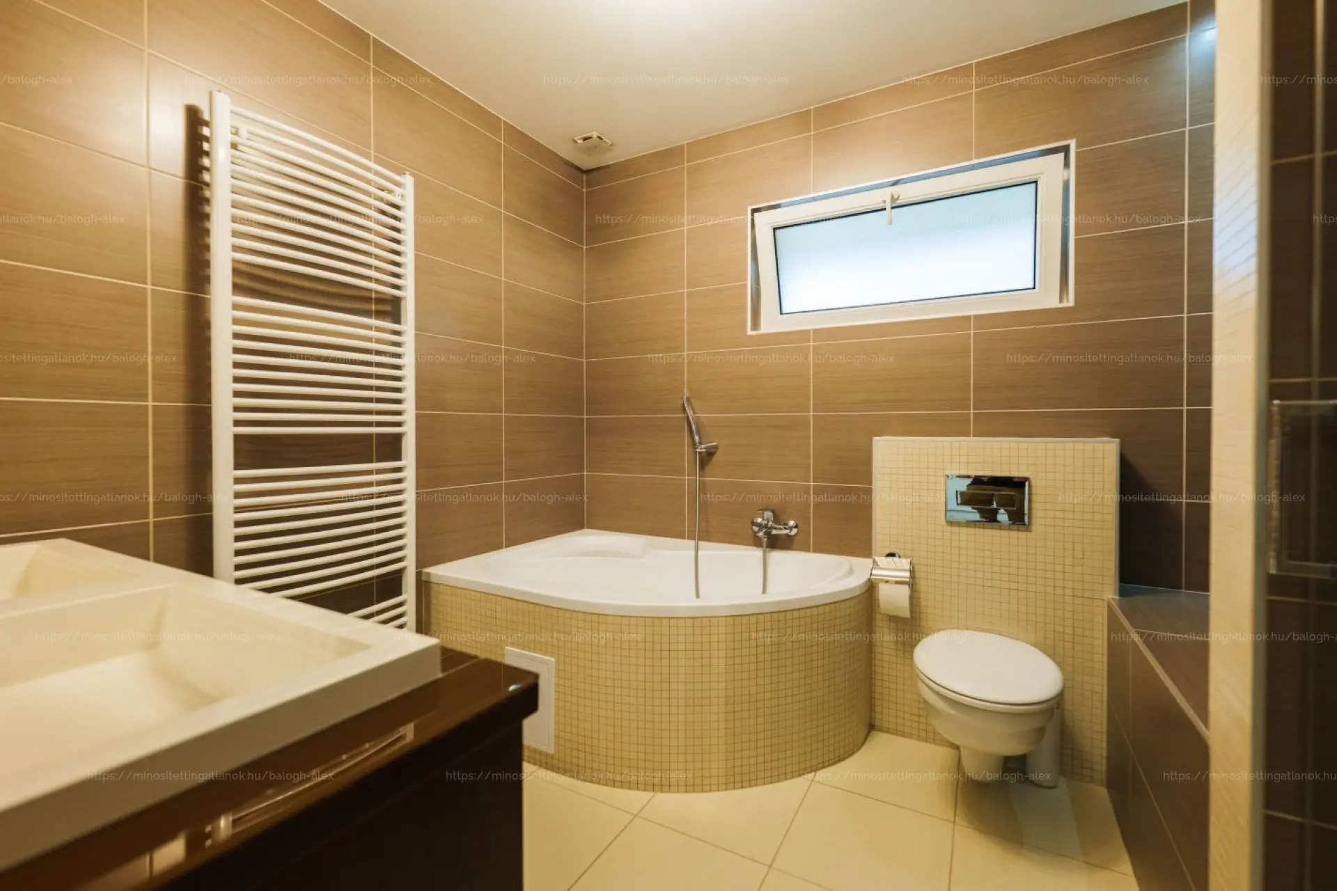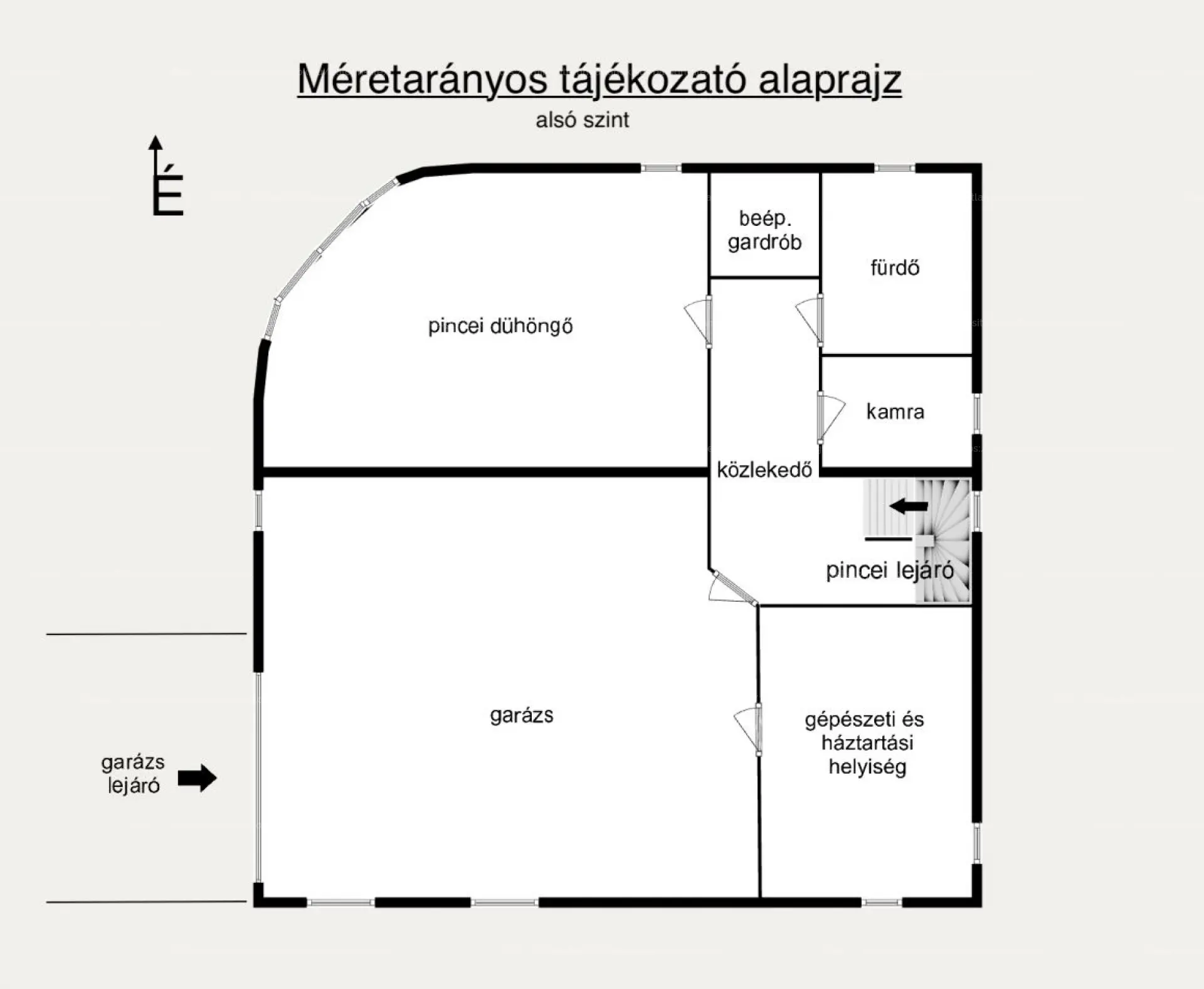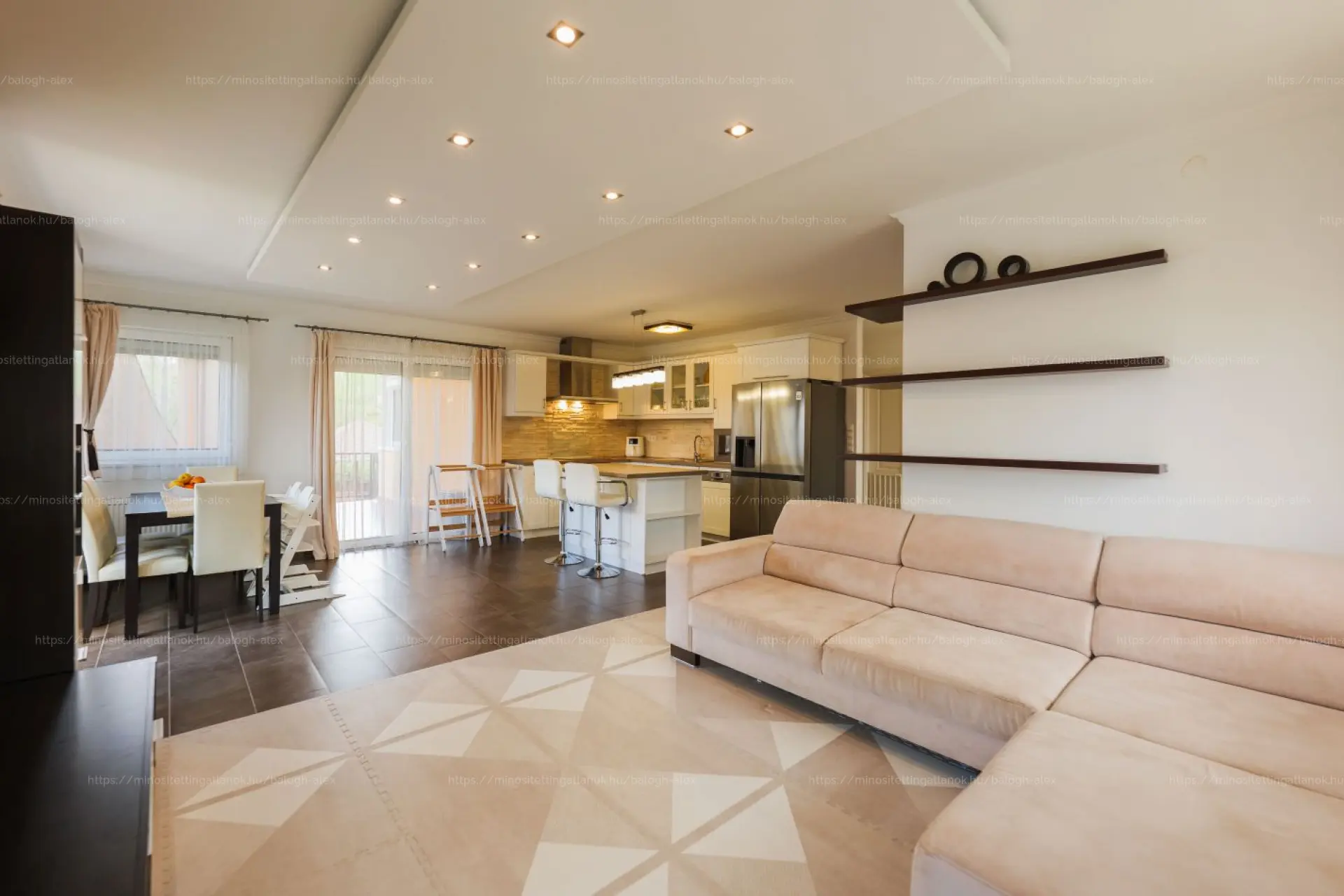 A 99 m²-es alsó szint ennél is több lehetőséget rejt: itt található a nagy méretű, többfunkciós „dühöngő” (jelenleg játszószoba, de lehet dolgozó, hobbiszoba vagy edzőterem is), valamint a kamra, a gépészeti helyiség és az alsó fürdőszoba. Ezek a helyiségek félszuterén jellegűek, szárazak, nem áznak, nem vizesednek, így hosszú távon is gondtalanul használhatók. Az alsó szinten található továbbá a nagyméretű garázs is, amely jelenleg egy nagy SUV-nek ad kényelmes helyet, de akár két közepes méretű autó is gond nélkül elfér egymás mellett.