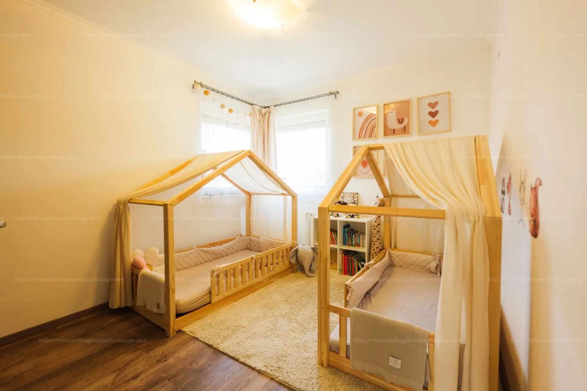 A 89 m²-es felső szinten található a tágas és fényes amerikai konyhás nappali, ahonnan közvetlen kijárat nyílik a teraszra. Ezen a szinten három külön nyíló hálószoba, illetve egy kádas és épített zuhanyzós fürdőszoba kapott helyet, így minden családtagnak biztosított a saját privát tér. A helyiségek jól átszellőztethetők, napfényesek, barátságosak.