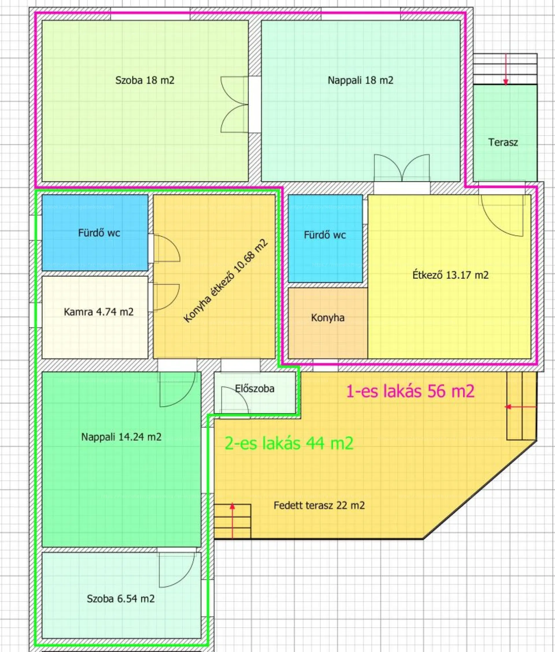 Jelenleg 2 külön lakrészből áll az összesen 100 m2-es családi ház. A fűtés közös, a vízfogyasztást almérővel lehet nyomon követni, az elektromos áram teljesen külön mérőórákkal mérhető.
