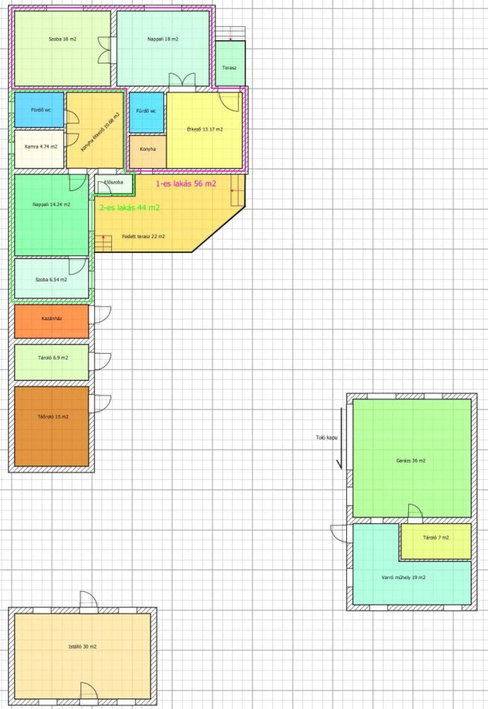 A lakóépület összesen 100 m2, ami kettő lakrészből tevődik össze, de összenyithatók, így egy család részére is ideális lehet.