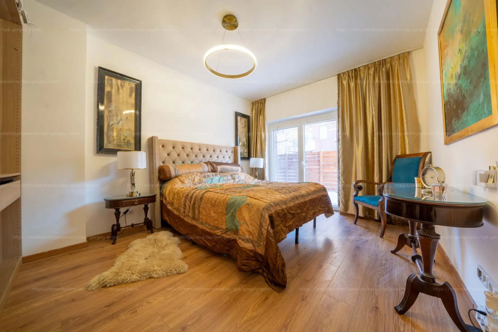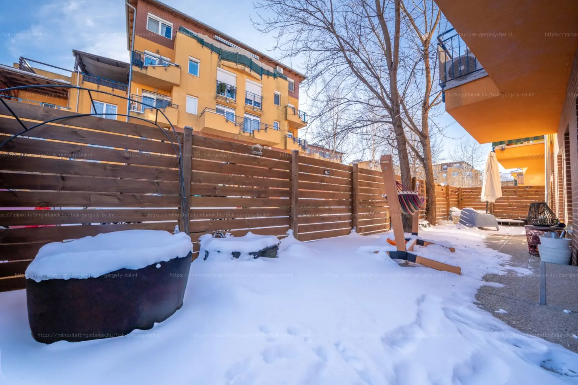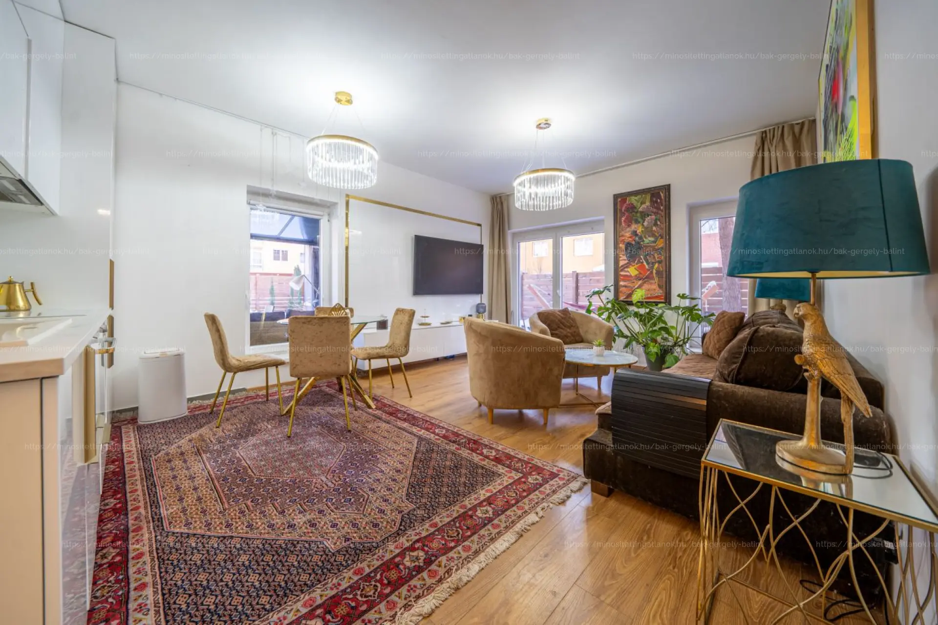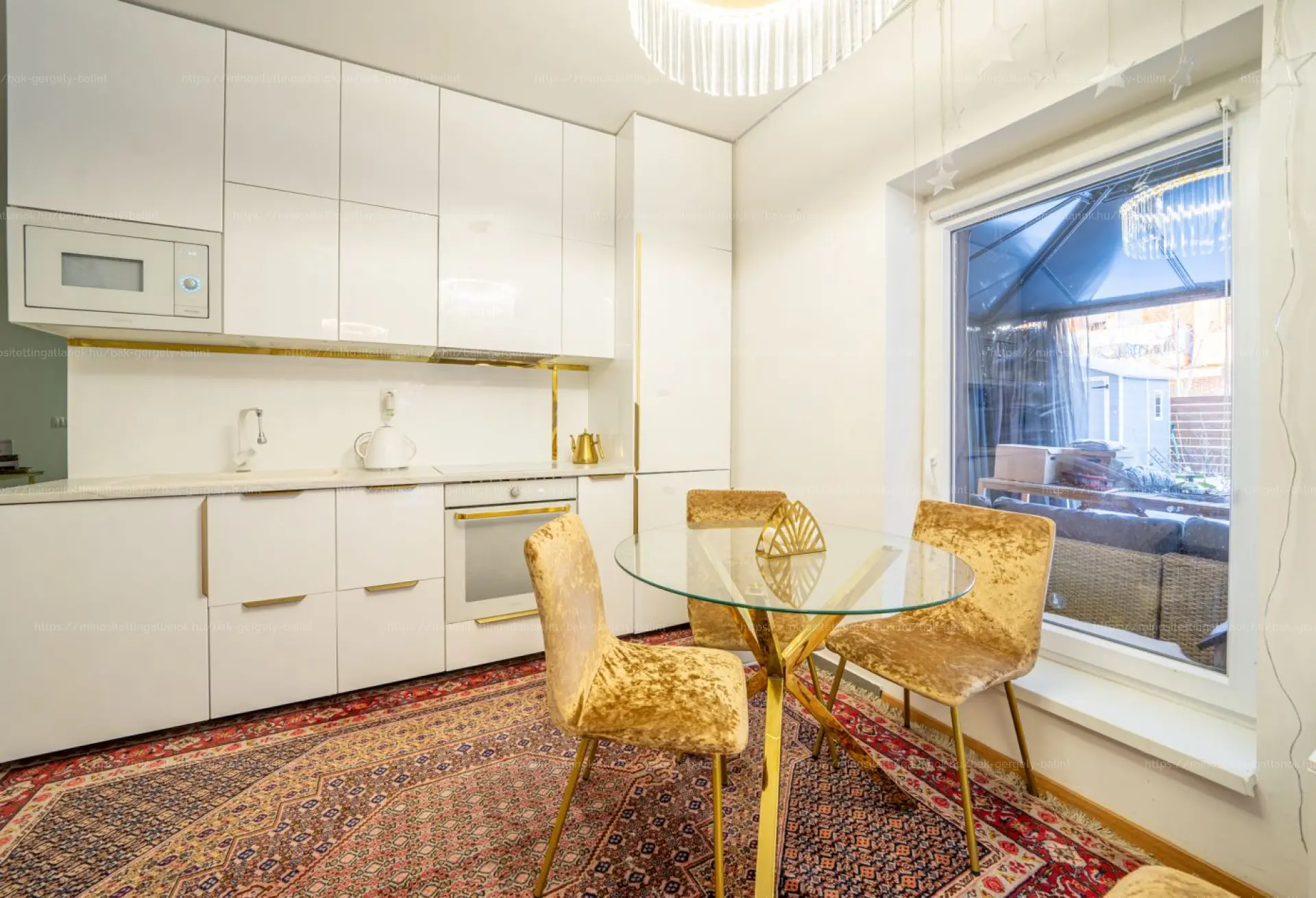 Az ingatlan amerikai konyhás nappalival, külön hálószobával és gyerekszobával rendelkezik, valamint gardrób, fürdőszoba és két önálló WC is szolgálja a kényelmet. A praktikus elrendezés jól elkülöníti a közösségi és a privát tereket, a kertkapcsolat pedig valódi pluszt ad a mindennapokhoz.