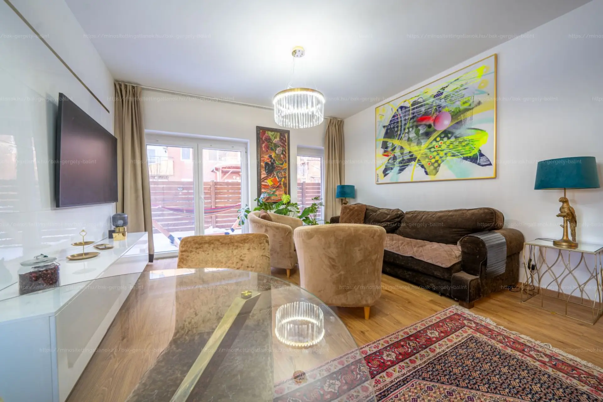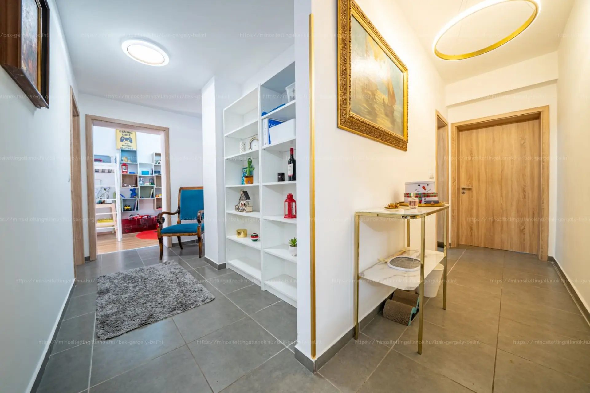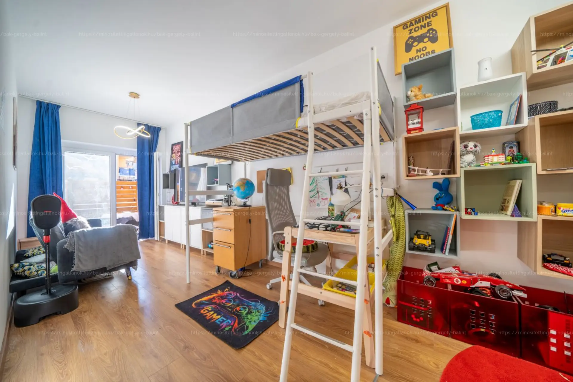 Az ingatlan amerikai konyhás nappalival, külön hálószobával és gyerekszobával rendelkezik, valamint gardrób, fürdőszoba és két önálló WC is szolgálja a kényelmet. A praktikus elrendezés jól elkülöníti a közösségi és a privát tereket, a kertkapcsolat pedig valódi pluszt ad a mindennapokhoz.