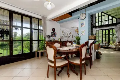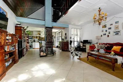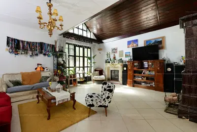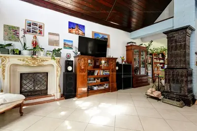 Hangulatos nappali eredeti, stílusos cserépkályhával és kandallóval.