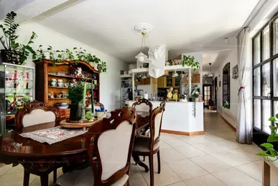 Modern, gépesített konyha, étkezővel, félig szeparált elrendezéssel.