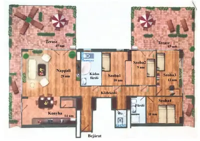 A lakás különlegessége, hogy két egymással megegyező méretű (2 x 45 nm) hatalmas terasz öleli körbe a nappalit és a hálószobákat, növelve a tér és komfortérzetet!
