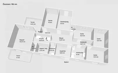 A földszintes ingatlan 186 nm, amely magában foglalja a 141 nm-es lakórészt, a garázst és a 2 teraszt is.