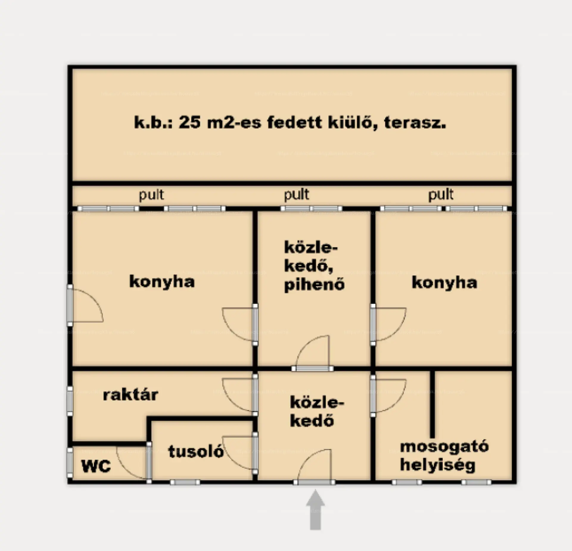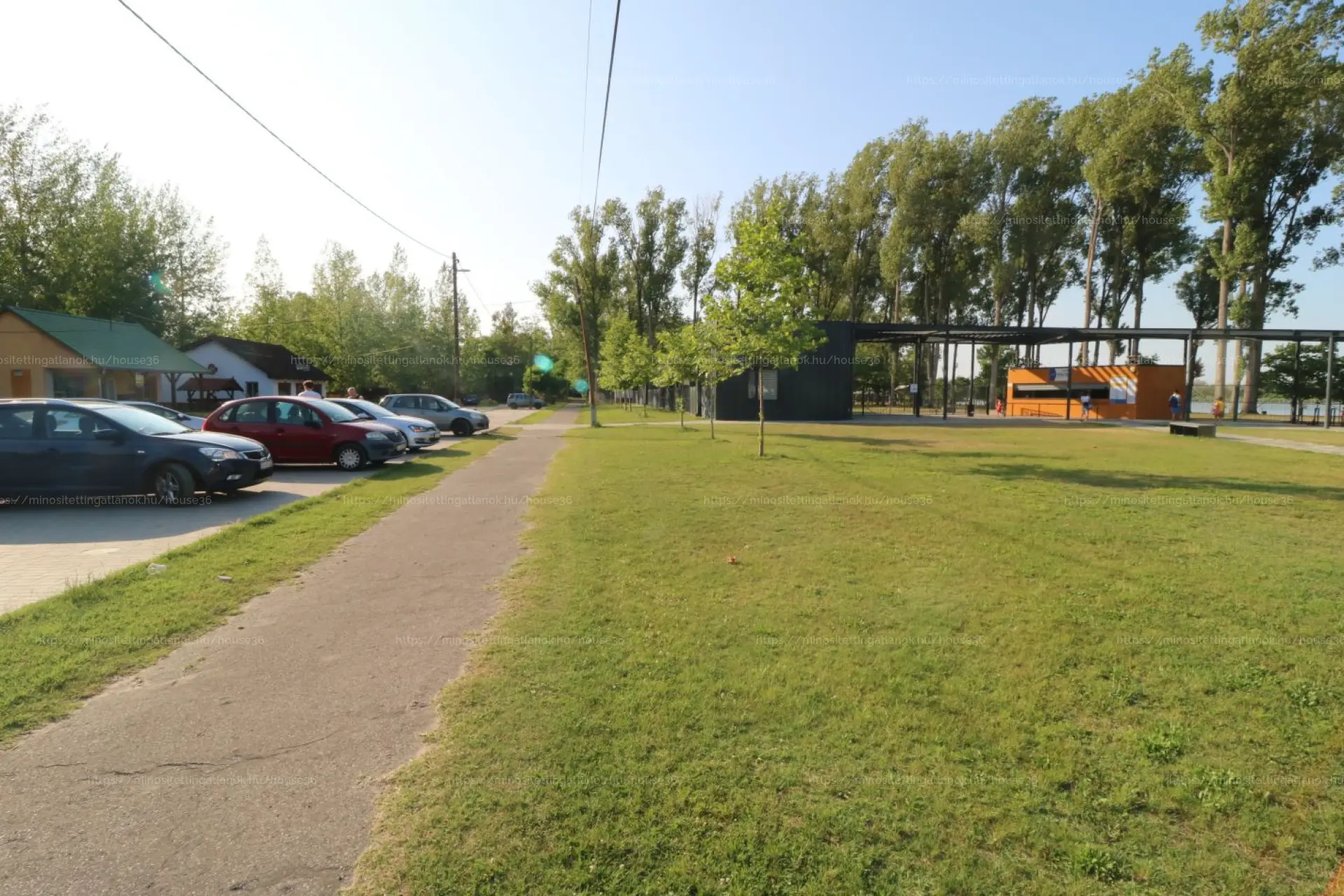 Az ingatlan részét képezi egy kb.: 25 m2-es fedett terasz is. Az ingatlan mellett élelmiszerbolt és körülötte parkoló található.