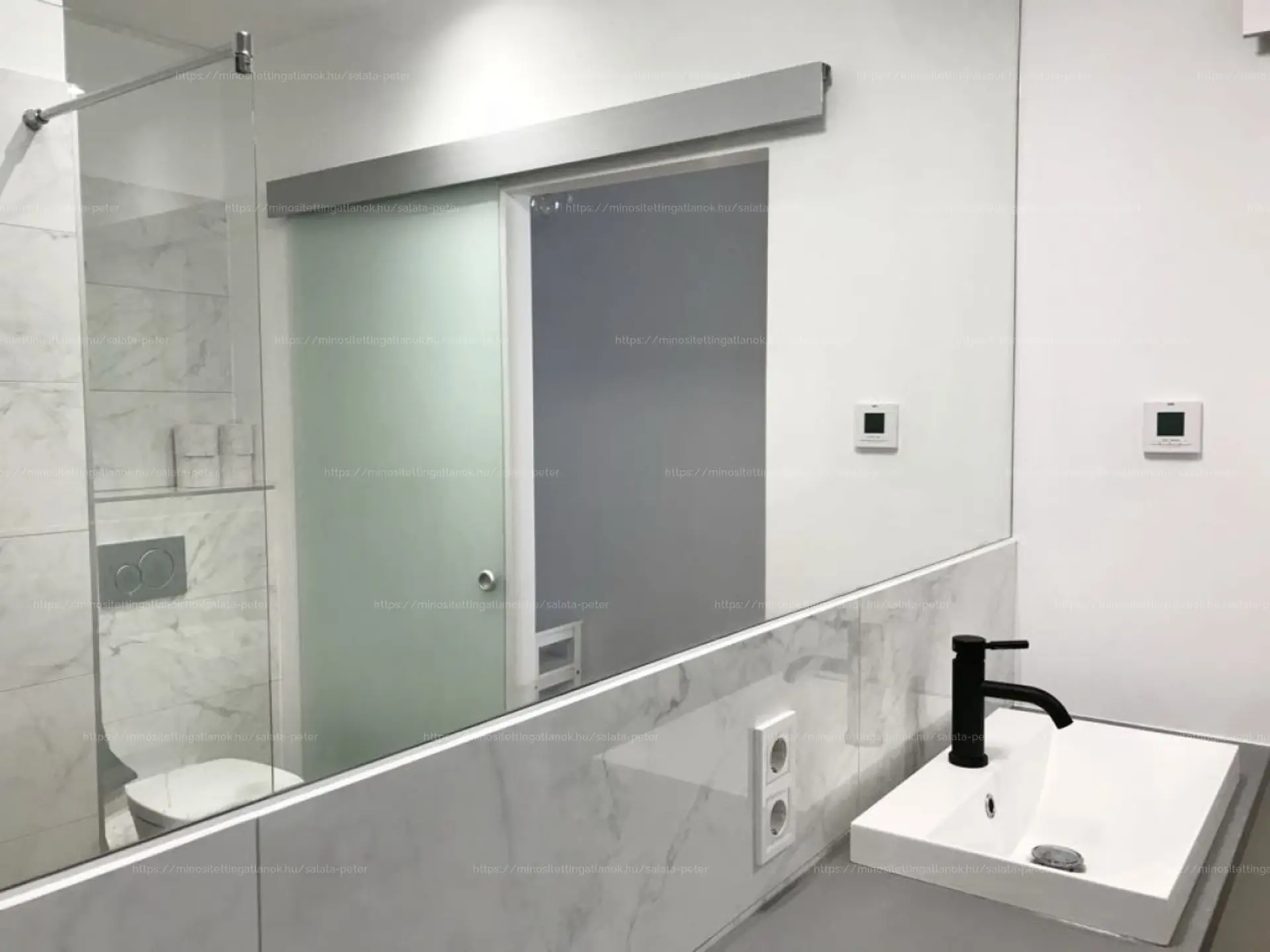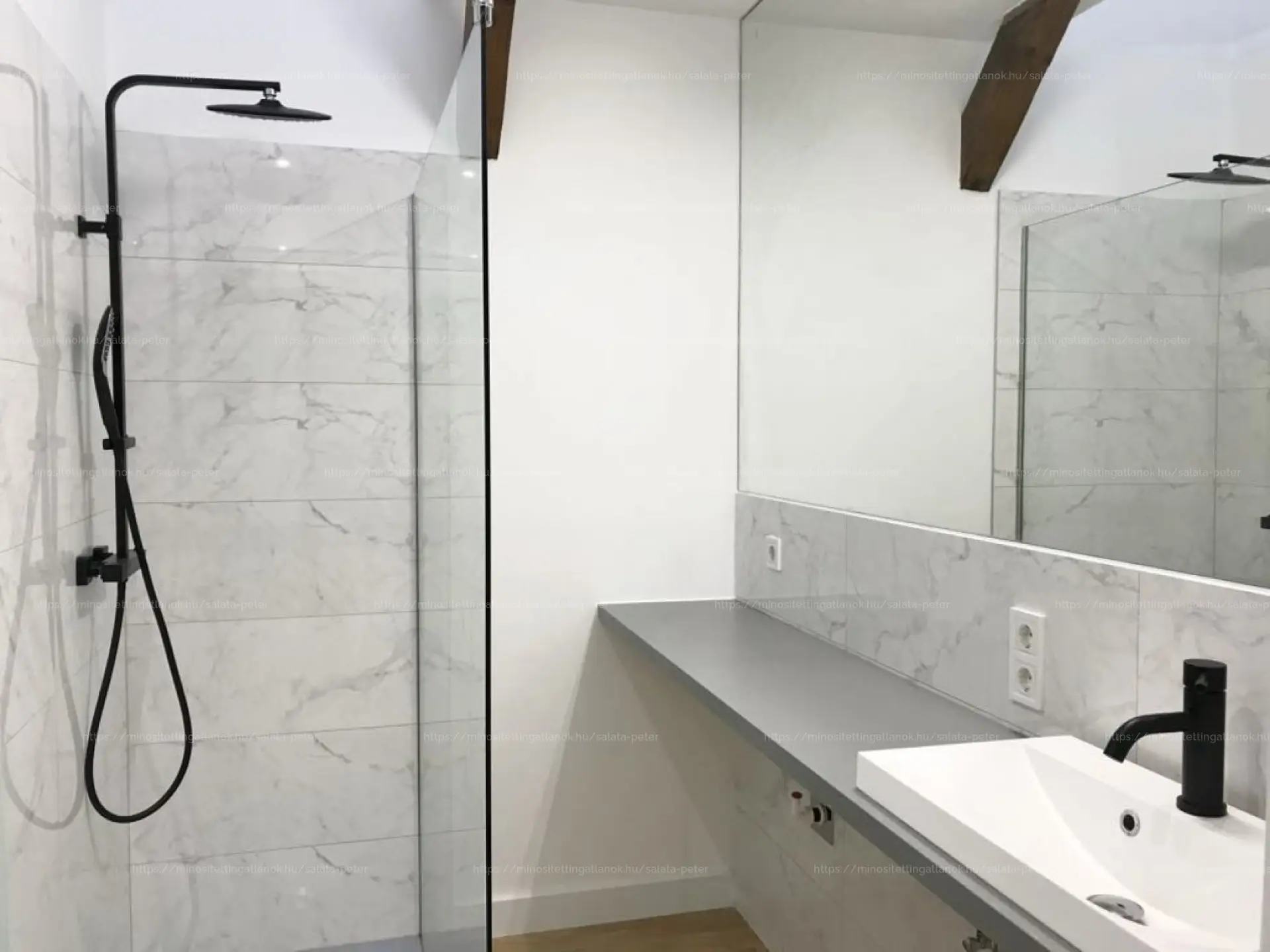 Tovább haladva a modern, zuhanyzós fürdőszobába jutunk, mely egyben van a toalettel.
