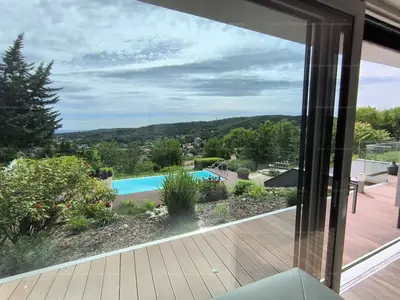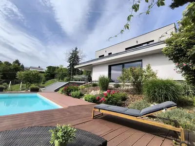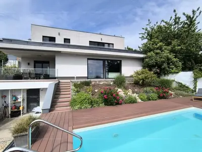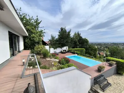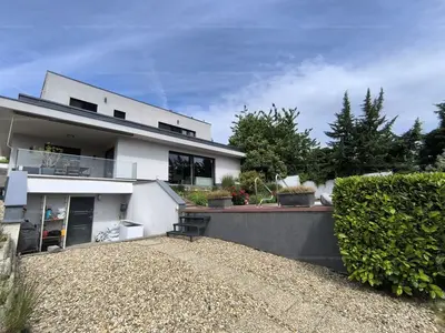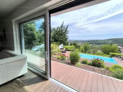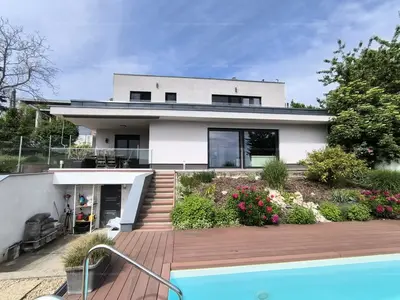 Ez a 2017-ben épült, kétszintes, bruttó 205 négyzetméteres ingatlan egy igazi kuriózum: ritka, elvehetetlen örökpanorámával rendelkezik, amely már az első pillanatban magával ragad. Ahogy belépünk az alsó szinten elhelyezkedő, hatalmas üvegfelületekkel rendelkező nappaliba, azonnal megnyílik előttünk a tér – és vele együtt a látvány is, amely a ház egyik legnagyobb értéke. A padlótól mennyezetig érő ablakokon keresztül egész évben élvezhetjük a táj változásait.