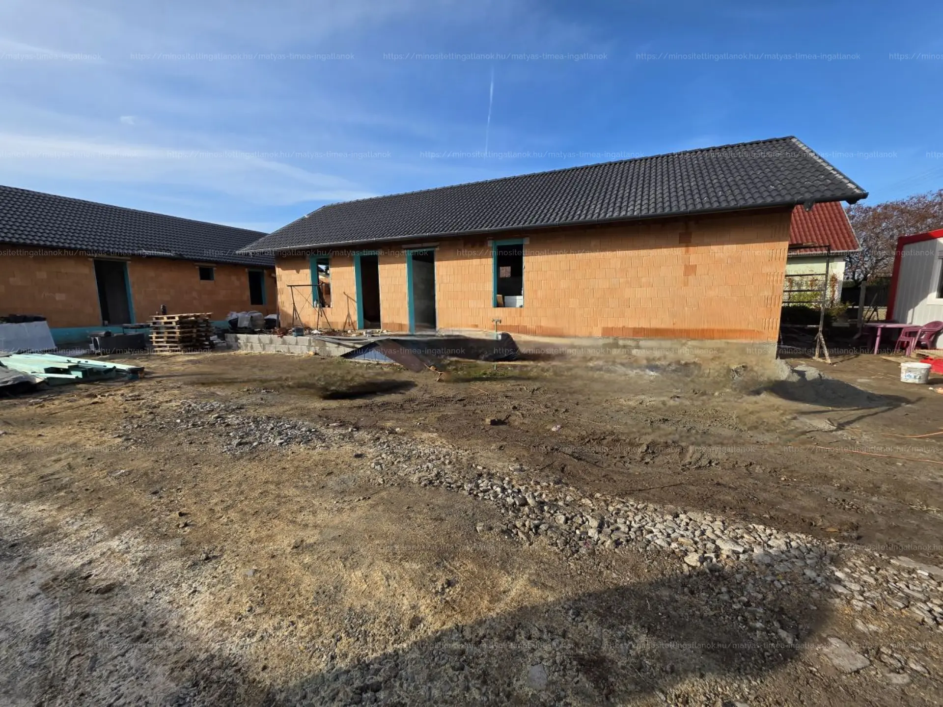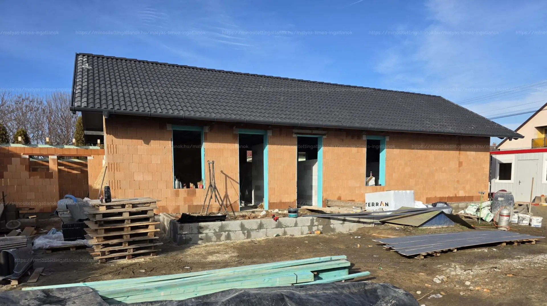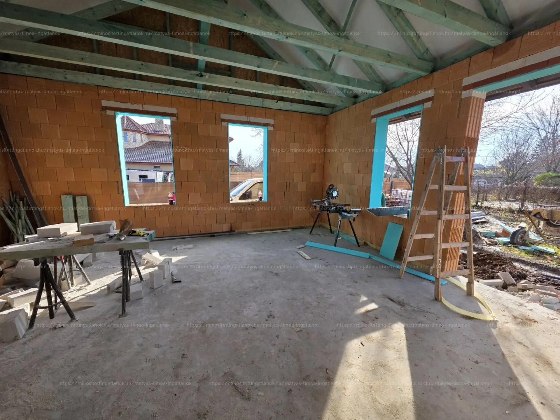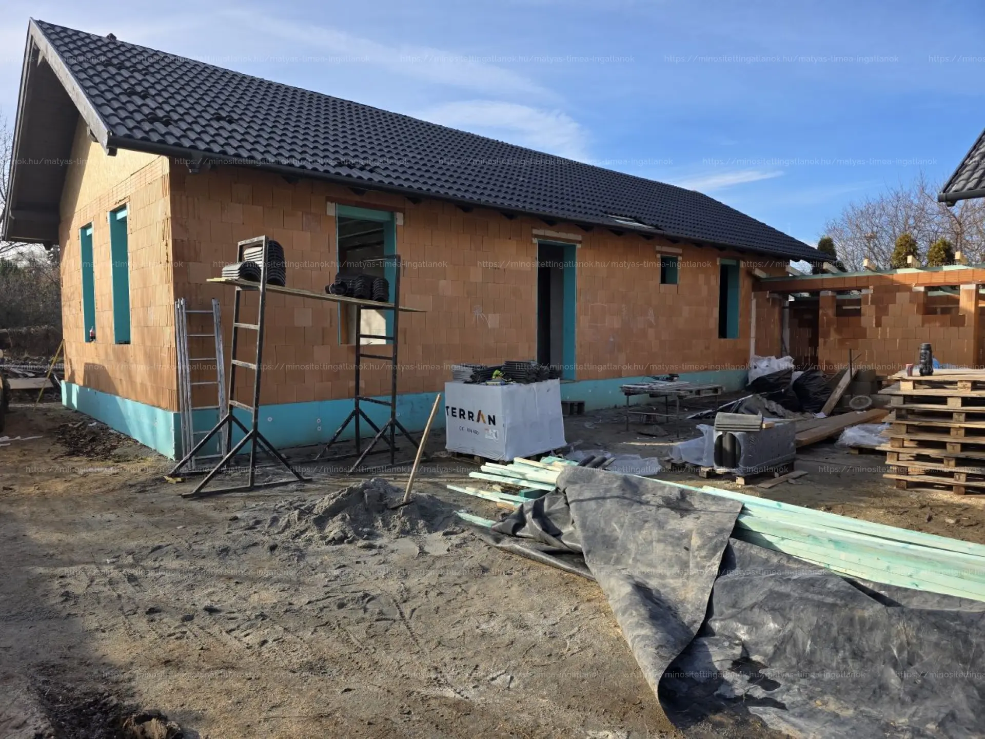 - Falszerkezete Porotherm 30-as téglából épül, 15cm-es külső hőszigeteléssel és 3 rétegű 6 légkamrás, fehér műanyag nyílászárók kerülnek beépítésre. Rejtett tokos redőny kiépítése!