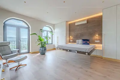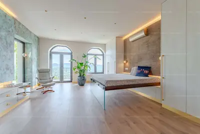 Ha sikerült elszabadulni a látványtól, nézzük meg a szülői hálószintet: hatalmas hálószoba, egyedi építésű, lebegő hatást keltő ággyal, kádas és zuhanyzós, gyönyörű fürdővel, terasszal, ahonnan még egy fokkal szebb a kilátás. A tetőtérben két nagyobb és egy kisebb szoba található, valamint egy duplamosdós, kádas fürdő és infraszauna. Minden szinten padlófűtés, 3 rétegű, betörésgátló ablakok, klíma, Sinclair hőszivattyú, magas minőségű burkolatok, szaniterek, háztartási berendezések.