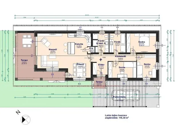 📐 A lakóterület 115,3 m², plusz 30 m² a fedett terasz