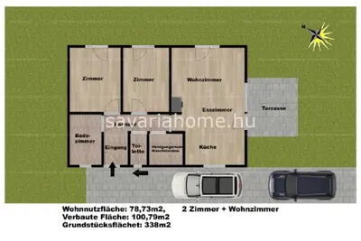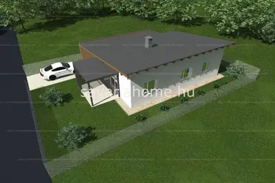 A 338nm-es telekre épülő 78,73nm lakótérrel rendelkező családi ház, 2 szoba + nappalis helyiség kiosztással, fürdőszobával, külön Wc-vel, háztartási helyiséggel rendelkezik. 15nm-es fedett terasz, 40nm-es térkövezett, fedett bejárat és autóbeálló, plusz 25nm-es nyitott autóbeálló áll rendelkezésre.
