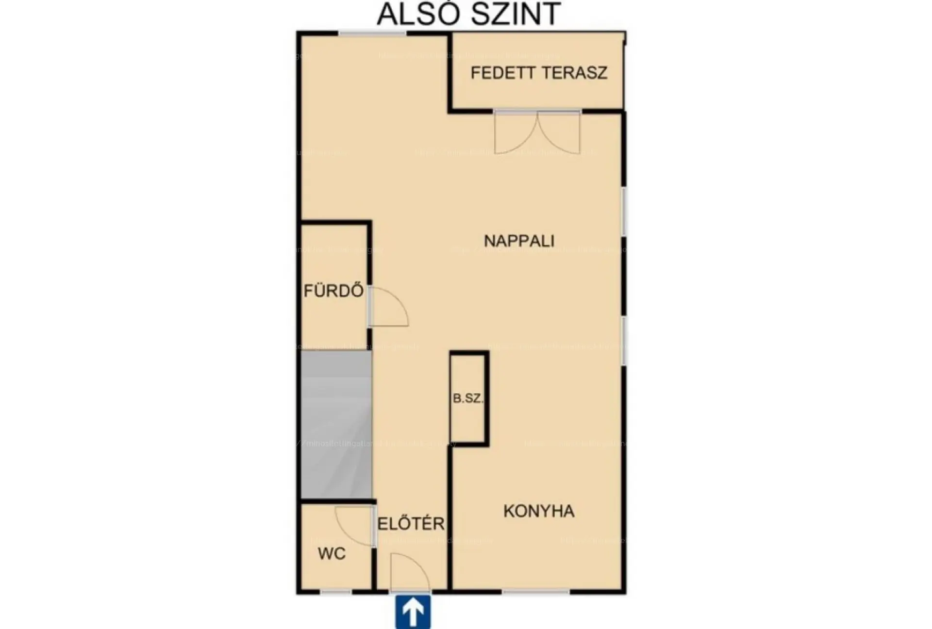 Az épület alsó szintjén tágas nappali-étkező-amerikai konyha főhelyiség, zuhanyzós fürdő, wc- mosdó, előtér helyiségek lettek kialakítva. Eredetileg 1 db hálószoba is volt ezen a szinten, de kisebb átalakítással (bontással) ezt a nappalihoz csatolták, így az eredetinél nagyobb közösségi tér képződött. A nappaliból fedett terasz nyílik, majd a kert következik.