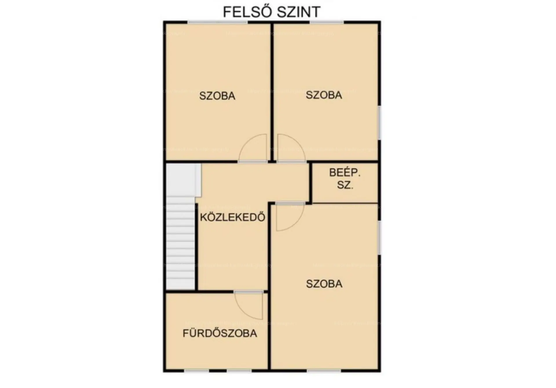 Felső szinten 3 db külön nyíló hálószoba, kádas fürdőszoba, közlekedő helyiségek vannak.