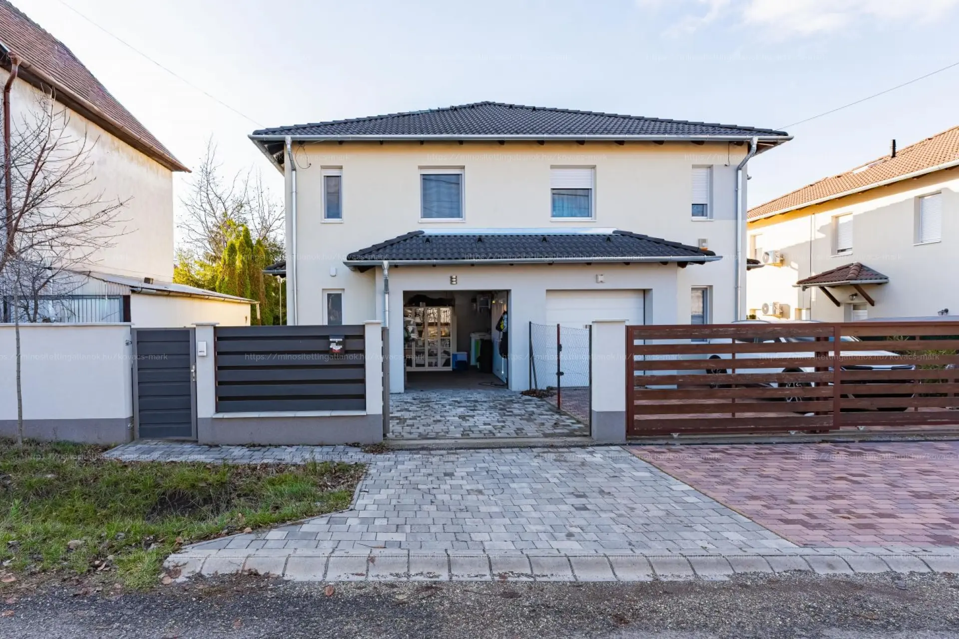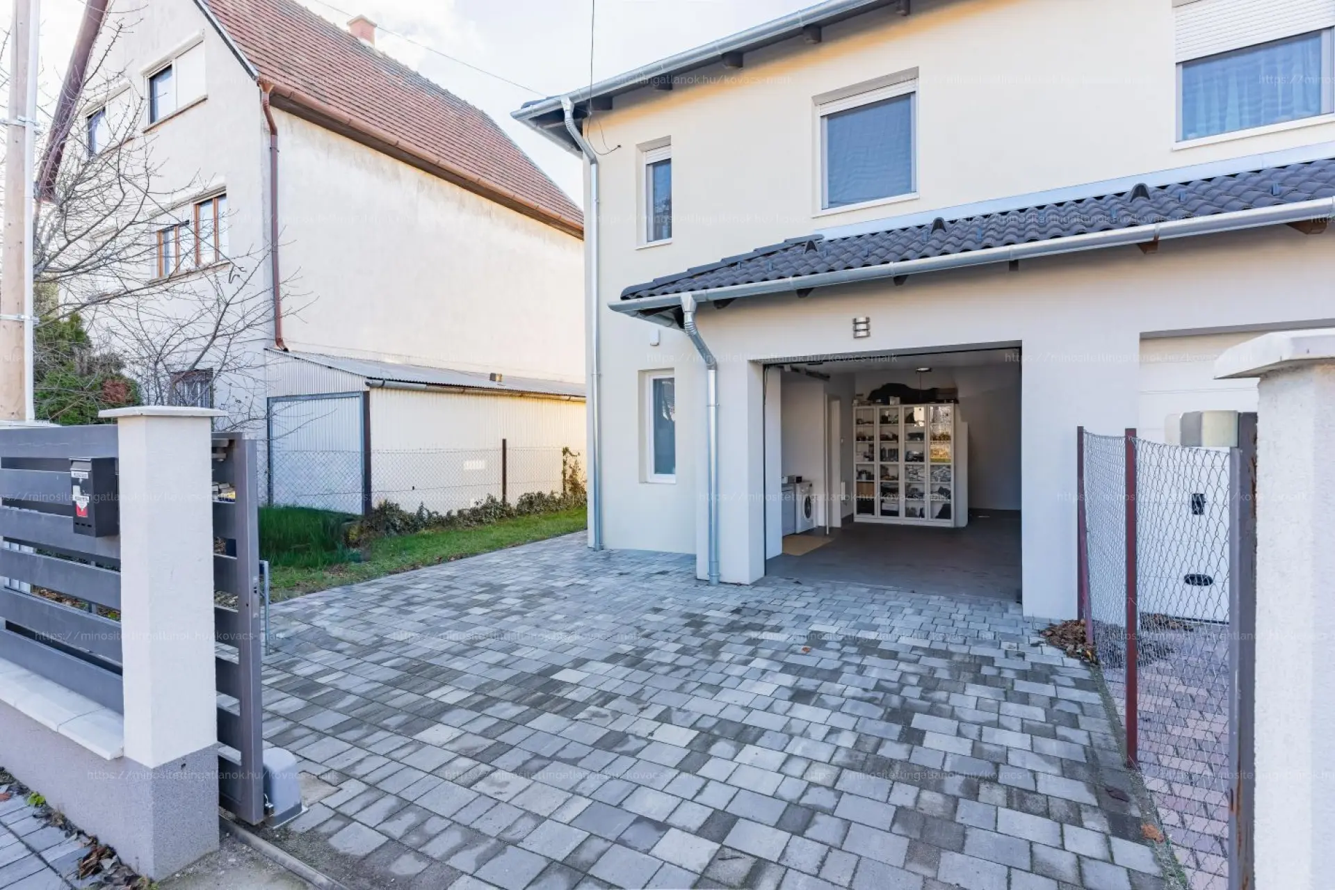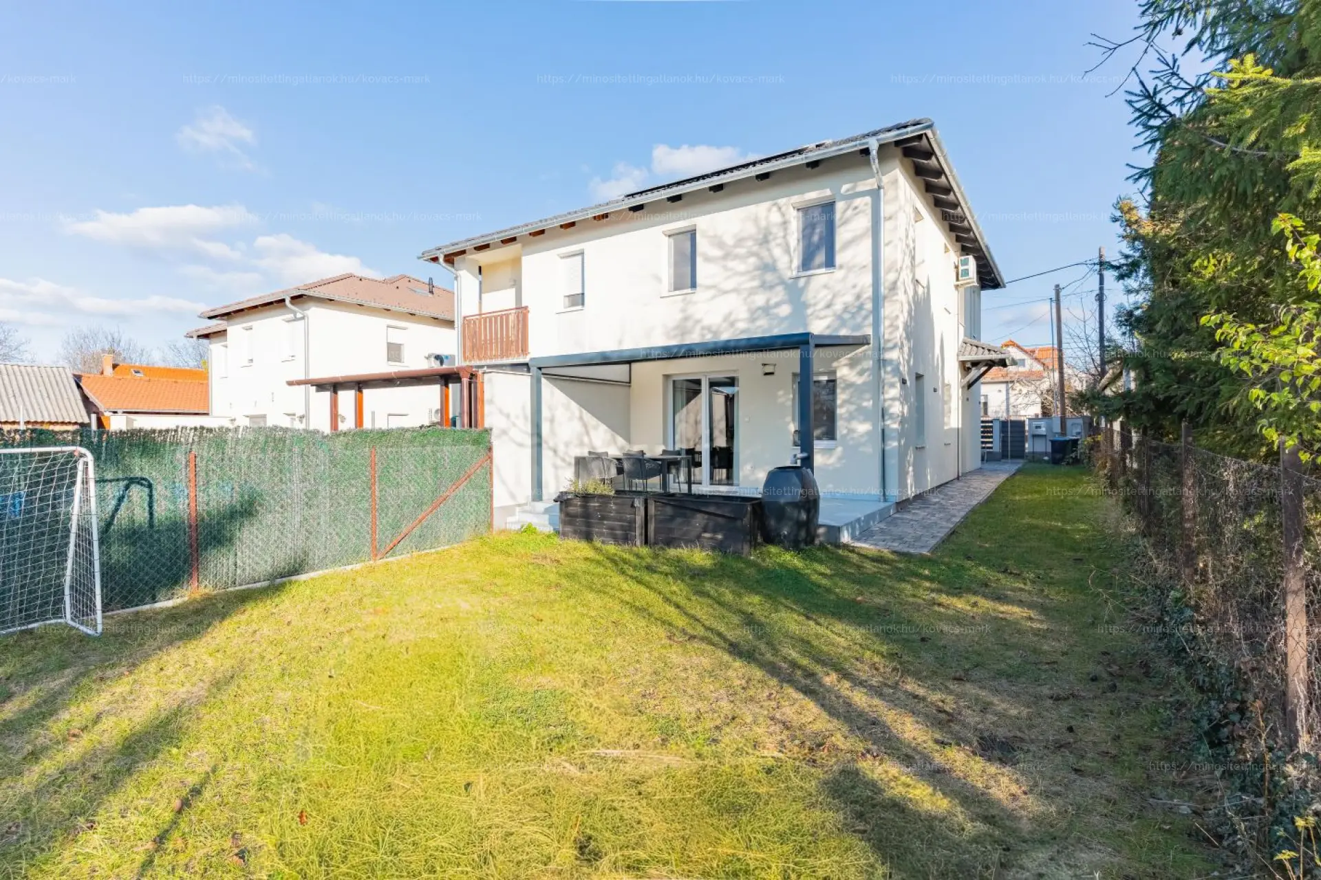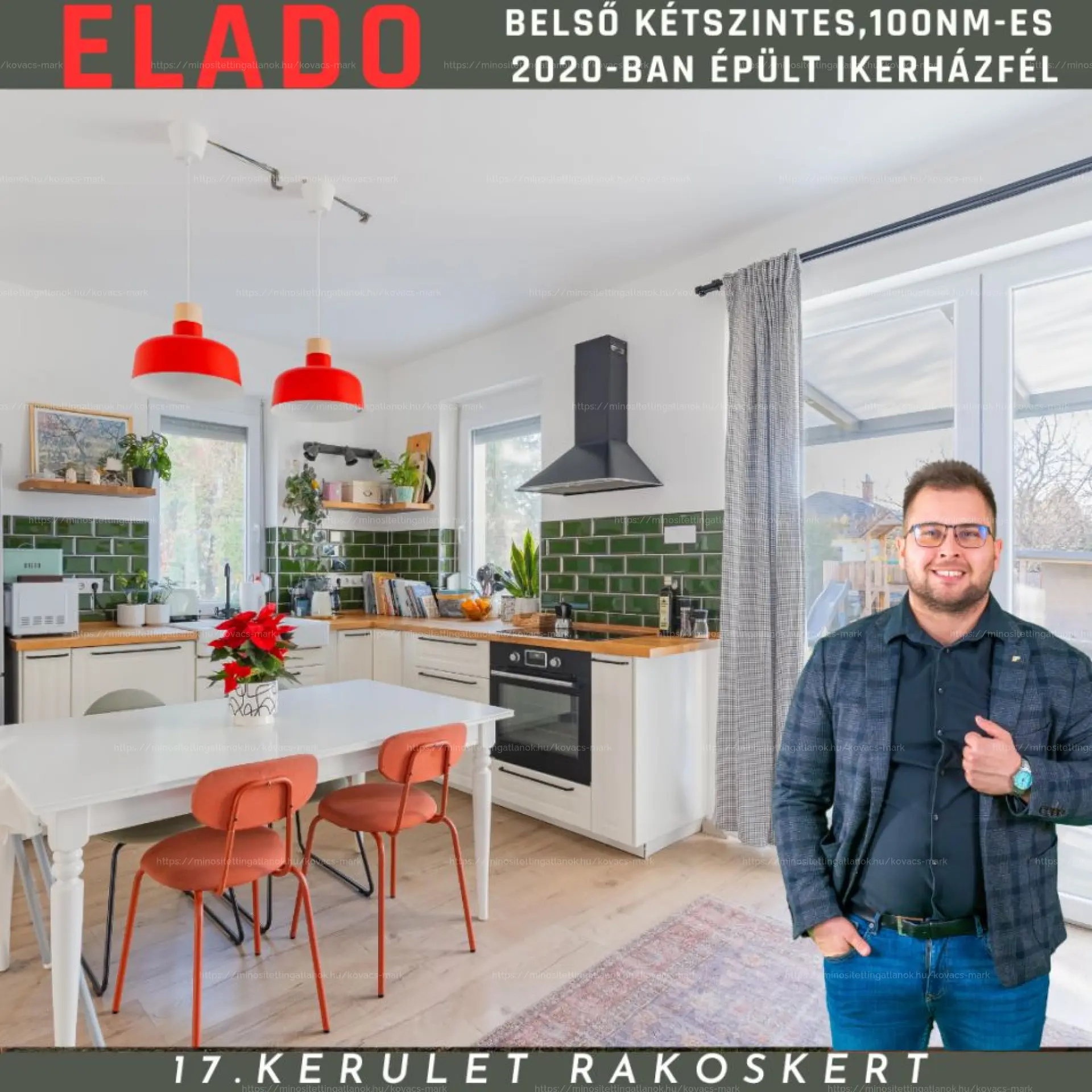 XVII. kerületben, Rákoskerten, csendes mellékutcában, 2020-ban épült, 100nm-es, belső kétszintes, amerikai konyhás nappalival, lenti wc-vel, 3db emeleti hálószobával, emeleti kádas fürdőszobával, garázzsal rendelkező ikerházfél 320nm-es kerten eladó.