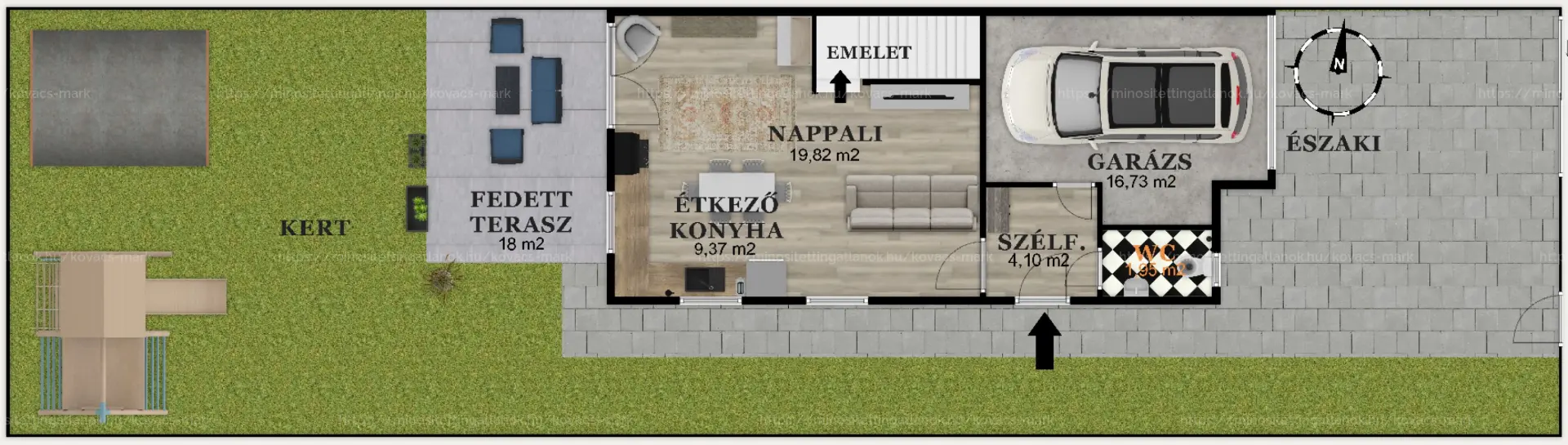 Előszoba/szélfogó, amerikai konyhás nappali, Wc és 20nm-es, 1 autó számára elegendő garázs, fedett (beépíthető) 18nm-es terasz .