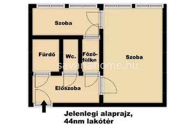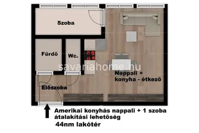A lakás jelenlegi térkapcsolatai jól alakíthatóak, így könnyű szerrel tudunk a jelenlegi főzőfülke - étkezős - nagy szobás verzióból, egy mai, modern, amerikai konyhás nappali + hálószobás lakást varázsolni. Ehhez a fotók között, átalakítási ötlet is található.