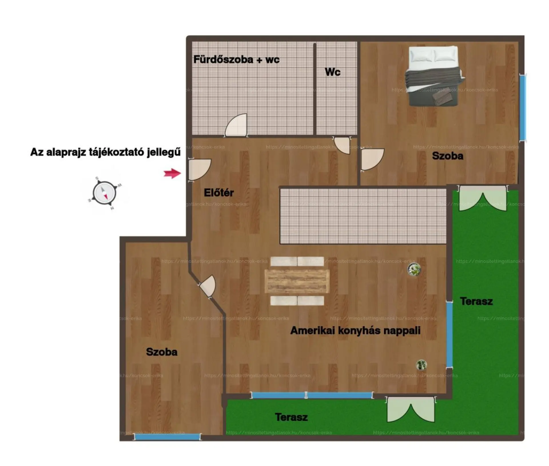 A 65 m²-es lakás igényes belső kialakítással, 21 m²-es tágas terasszal, 5 m²-es külön tárolóval, valamint saját teremgarázs-beállóval rendelkezik, igény eseten megvásárolható.