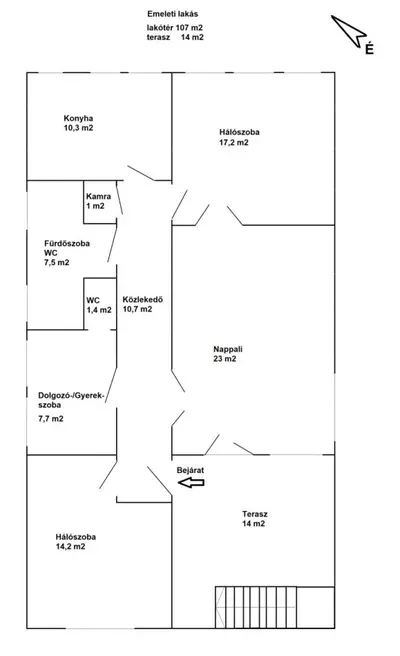 Az emeleti lakás 107 m²-es lakóterülettel és egy 14 m²-es, déli és nyugati irányból nyitott terasszal rendelkezik. A nappali + 3 hálószobás elrendezés ideális családoknak, alkotóknak, vagy azoknak, akik szeretik, ha van helyük lélegezni. A konyha különálló, étkezős kialakítású, így a nappali valóban a pihenés és a közös pillanatok tere maradhat.