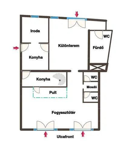 Konyha, pult, iroda, vendégmosdók