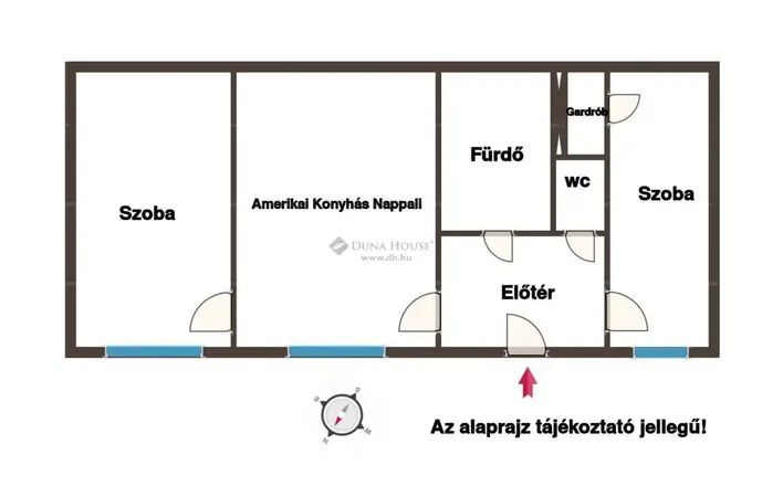 65 m² alapterület, nappali + két külön nyíló hálószoba