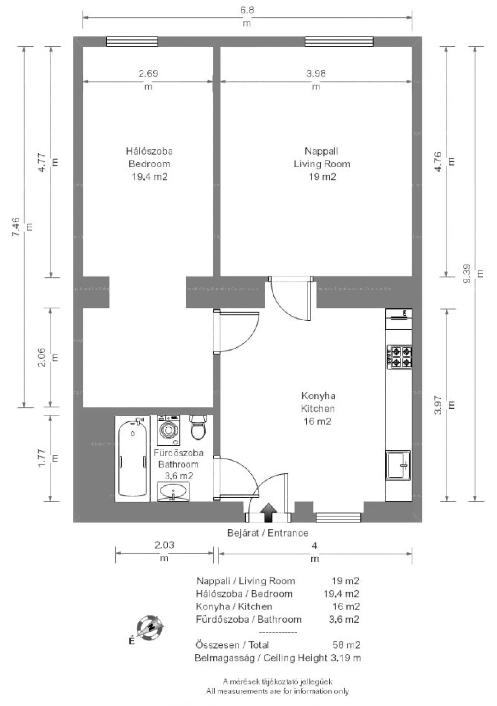 ✓ valóságban 58m²-es, tulajdoni lapon 56m² területű,