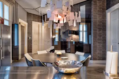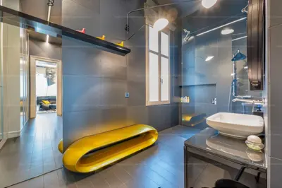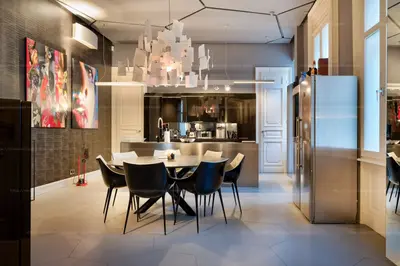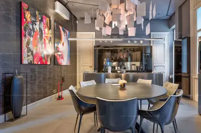 A lakás nagy konyha-étkezővel, hatalmas reprezentatív nappalival, két óriási hálószoba lakrésszel, saját fürdőkkel és gardróbbal rendelkezik. A terek funkciót tekintve jól elkülönülnek egymástól, mégis egyben jelennek meg. Van tárgyaló és dolgozó rész, a nappaliban üvegfallal elkülönített térben álló jakuzzi, a panorámás fürdőszobában gőzkabin-szauna lett beépítve, meditáló-pihenő résszel, a legszebb kilátással a város forgatagára.