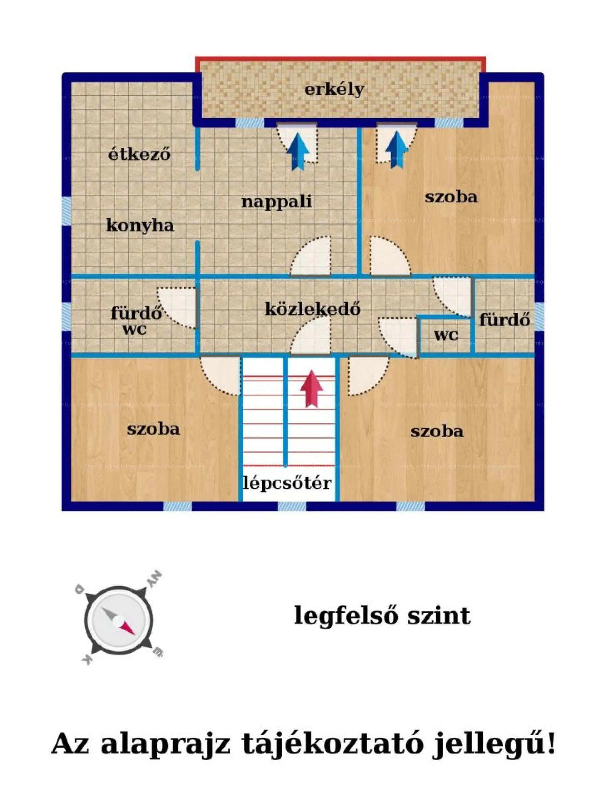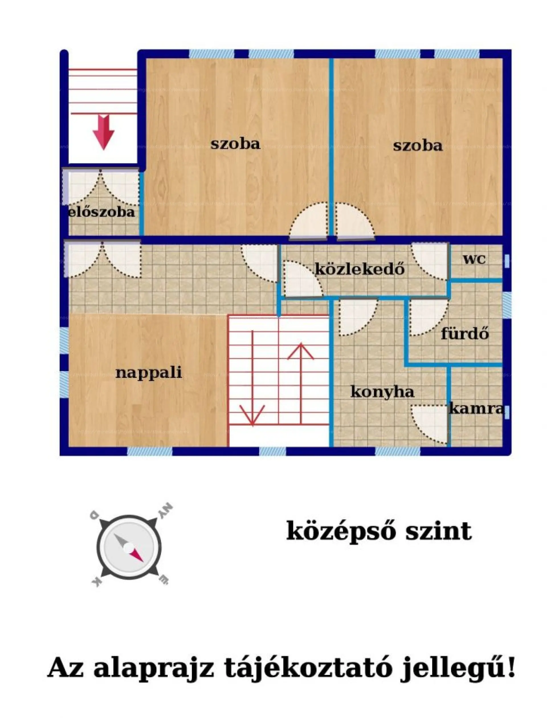 A középső szinten két szoba, konyha, kamra, a közlekedőből nyíló kádas fürdőszoba és külön toalett található. A legfelső emeleten az utcafronton konyha-étkező nappalival valamint egy szoba található, az utcafrontra néző tágas erkély mind a nappaliból, mind a szobából megközelíthető. A közlekedőből a kert felé további két szoba kapott helyet. Ezen a szinten egy zuhanyzós fürdőszoba toalettel valamint egy további zuhanyzós fürdő és külön helyiségben még egy toalett áll rendelkezésre.