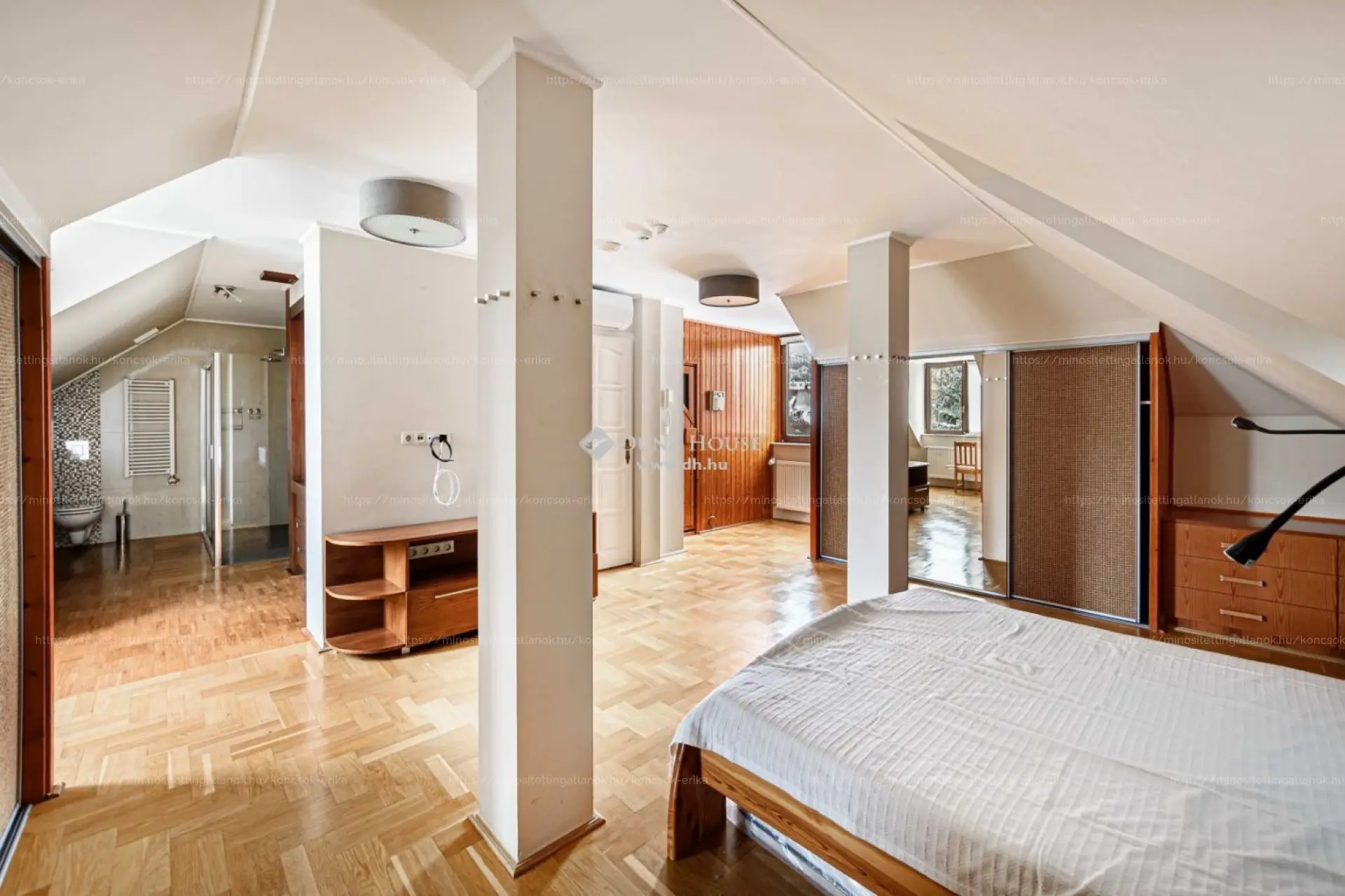 Az emeleten három különnyíló hálószoba teraszokkal (10 m2, és 4 m2), és egy fürdőszoba kapott helyet.A szobák mindegyike beépített gardróbbal , fűtő-hűtő klímával felszerelt. Kaputelefon az emeleti,és tetőtéri lakásokból is kezelhető. A tetőtérben egy hatalmas lakosztály kapott helyet egy légtérben a fürdőszobával ( dupla zuhanykabin, kétállásos mosdó, wc, szolárium), valamint beépített gardróbbal. Finn szauna is rendelkezésre áll.