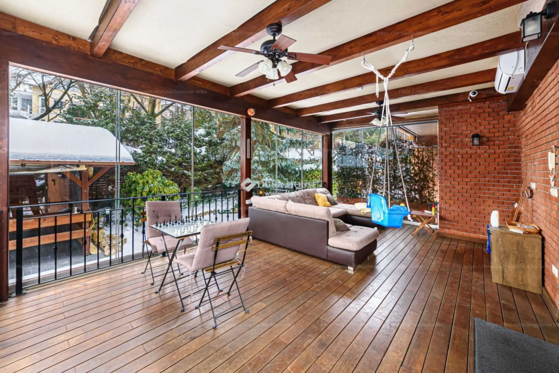 Budapest, 11.kerületében Sasadon , csendes, zöld utcában, a Beregszász úton eladó nettó 340 m2 lakóterülettel rendelkező ikerház kiváló elosztással, napsütéses terekkel, nagy,-és kis méretű különböző tájolású teraszokkal, hangulatos nyári konyhával, fenyőfák ölelésében.
