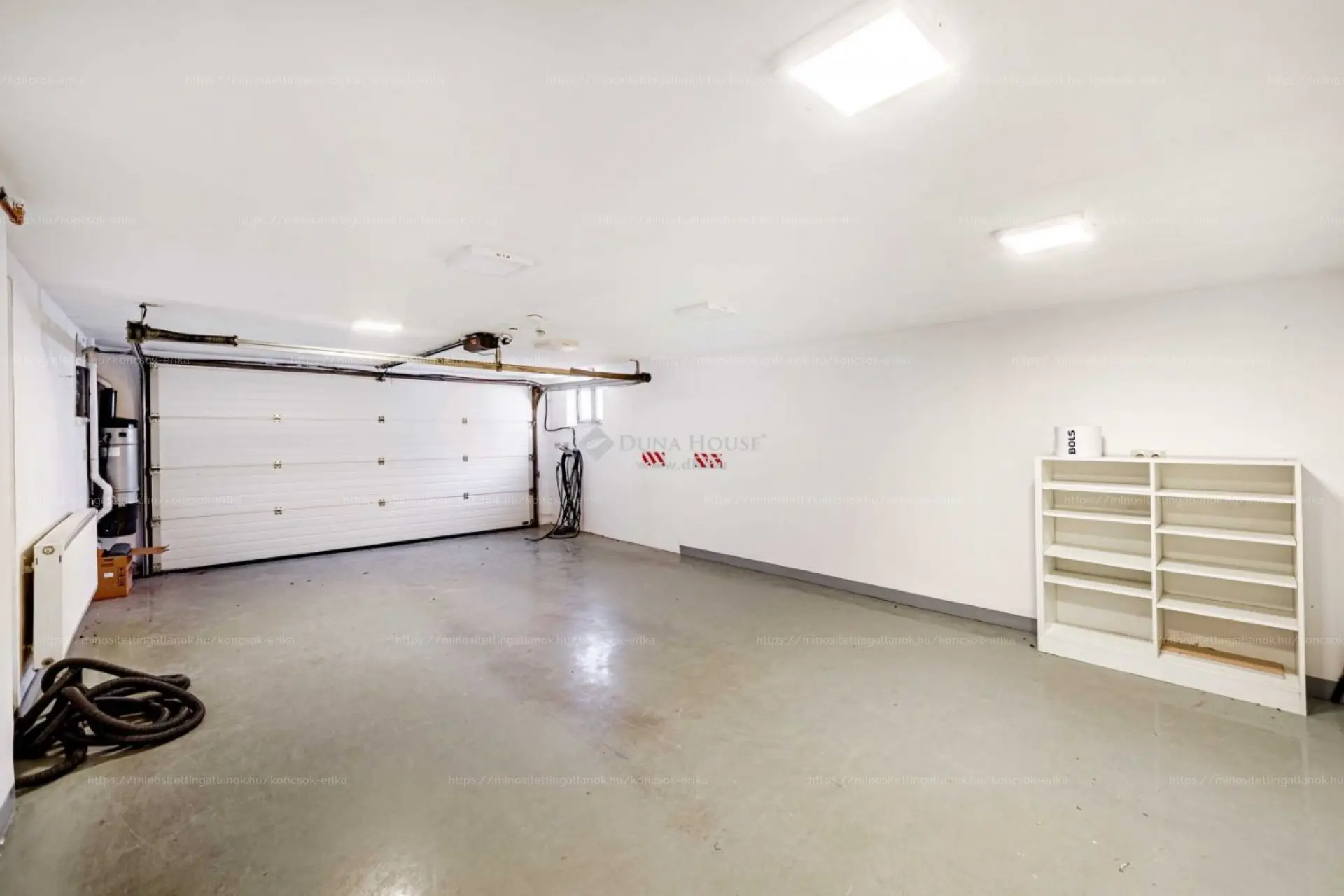 A pinceszinten 36, 7 m2-es kétállásos garázs Hörmánn Promatic elektromos kapuval, ipari árammal, riasztóval. Található itt egy billiárd ,-és darts szalon, egy beépített gardrób, valamint háztartási helyiség is.A fűtés gázkazánnal valósul meg. radiátoros hőleadókkal .Minden radiátor egyedileg szabályozható -Honeywell termosztát.További extrák:fűthető kocsibeálló, központi porszívó (Beam Elektrolux),riasztó, és kamera rendszer, optikai kábel.