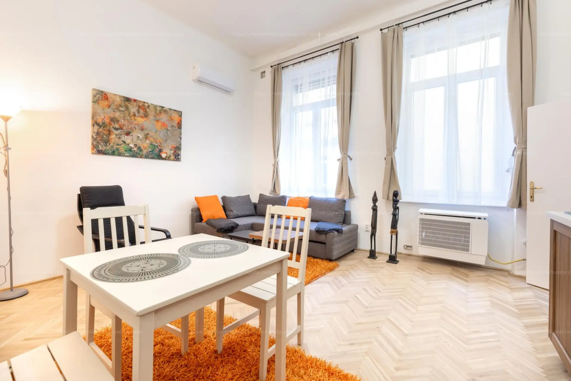 A lakás teljesen bútorozott és gépesített (mosógép, hűtő, sütő, főzőlap, konyhai kiegészítők), így azonnal költözhető.