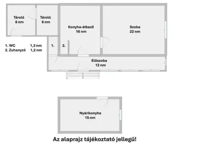 🛏️ Helyiségek: 1 szoba, előszoba-közlekedő, konyha-étkező, zuhanyzó + WC